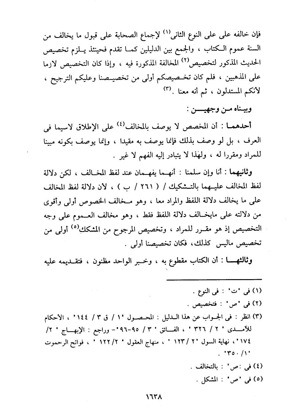 وثانيهما: أنا وإن سلمنا: أنهما يفهمان عند لفظ المخالف، لكن دلالة لفظ المخالف عليهما بالتشكيك/ (261/ ب)، لأن دلالة لفظ المخالف على ما يخالف دلالة اللفظ والمراد معا، وهو مخالف الخصوص أولى وأقوى من دلالته على ما يخالف دلالة اللفظ فقط، وهو مخالف العموم على وجه التخصيص إذ هو مقرر للمراد، وتخصيص المرجوح من المشكك أولى من تخصيص ما ليس كذلك، فكان تخصيصنا أولى.