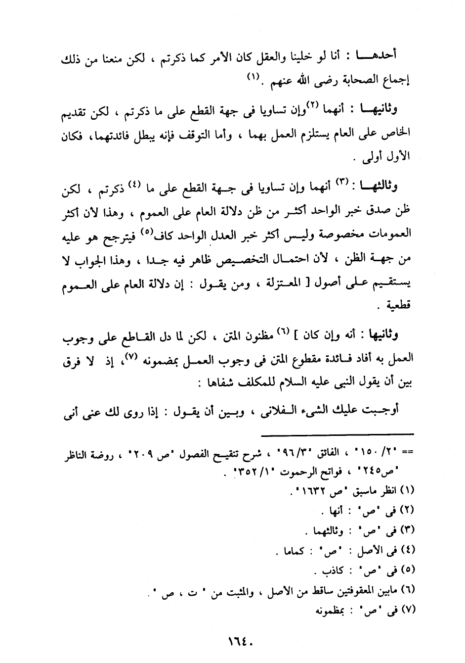 وثالثها: أنهما وإن تساويا في جهة القطع على ما ذكرتم، لكن ظن صدق خبر الواحد أكثر من ظن دلالة العام على العموم، وهذا لأن أكثر العمومات مخصوصة وليس أكثر خبر العدل الواحد كاف فيترجح هو عليه من جهة الظن، لأن احتمال التخصيص ظاهر فيه جدا، وهذا الجواب لا يستقيم على أصول [المعتزلة، ومن يقول: إن دلالة العام على العموم قطعية.