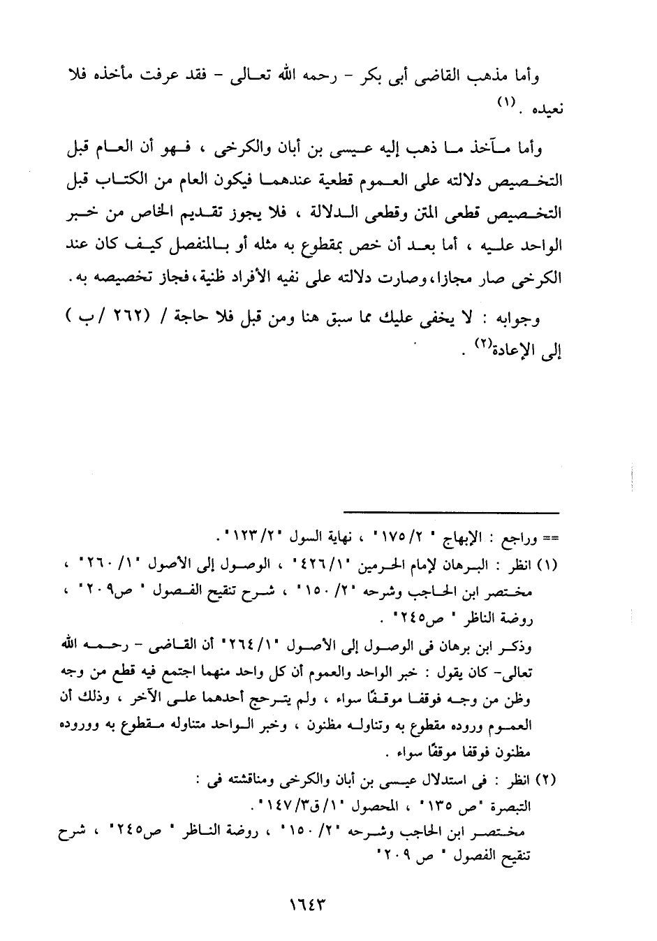 وأما مذهب القاضي أبي بكر- رحمه الله تعالى- قد عرفت مأخذه فلا نعيده.