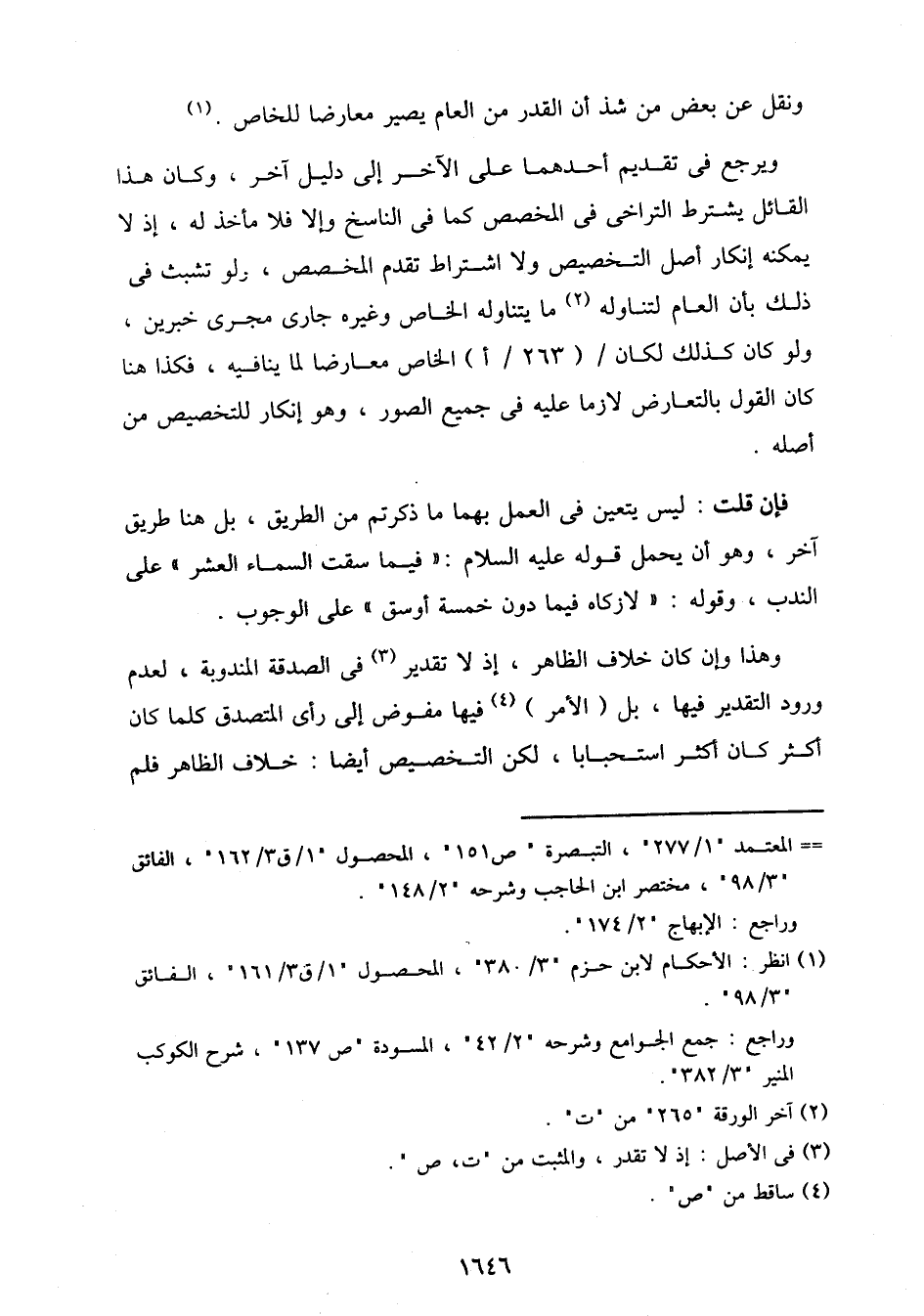ويرجع في تقديم أحدهما على الآخر إلى دليل آخر، وكان هذا القائل يشترط التراخي في المخصص كما في الناسخ وإلا فلا مأخذ له، إذ لا يمكنه إنكار أصل التخصيص ولا اشتراط تقدم المخصص، ولو تشبث في ذلك بأن العام لتناوله ما يتناوله الخاص وغيره جاري مجرى خبرين، ولو كان كذلك لكان/ (263/ أ) الخاص معارضا لما ينافيه، فكذا هنا كان القول بالتعارض لازما عليه في جميع الصور، وهو إنكار للتخصيص من أصله.