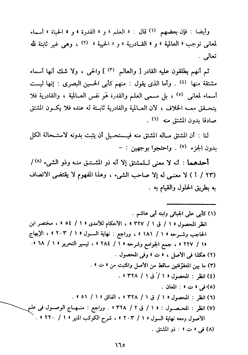 ثم أنهم يطلقون عليه القادر [والعالم] والحي، ولا شك أنها أسماء مشتقة منها. وأما الذي يقول: منهم كأبي الحسن البصري: إنها ليست أسماء لمعاني، بل مسمى العلم والقدرة هو نفس العالمية، والقادرية فلا يتحقق معه الخلاف، لأن العالمية والقادرية ثابتة له عنده فلا يكون المشتق صادقا بدون المشتق منه.