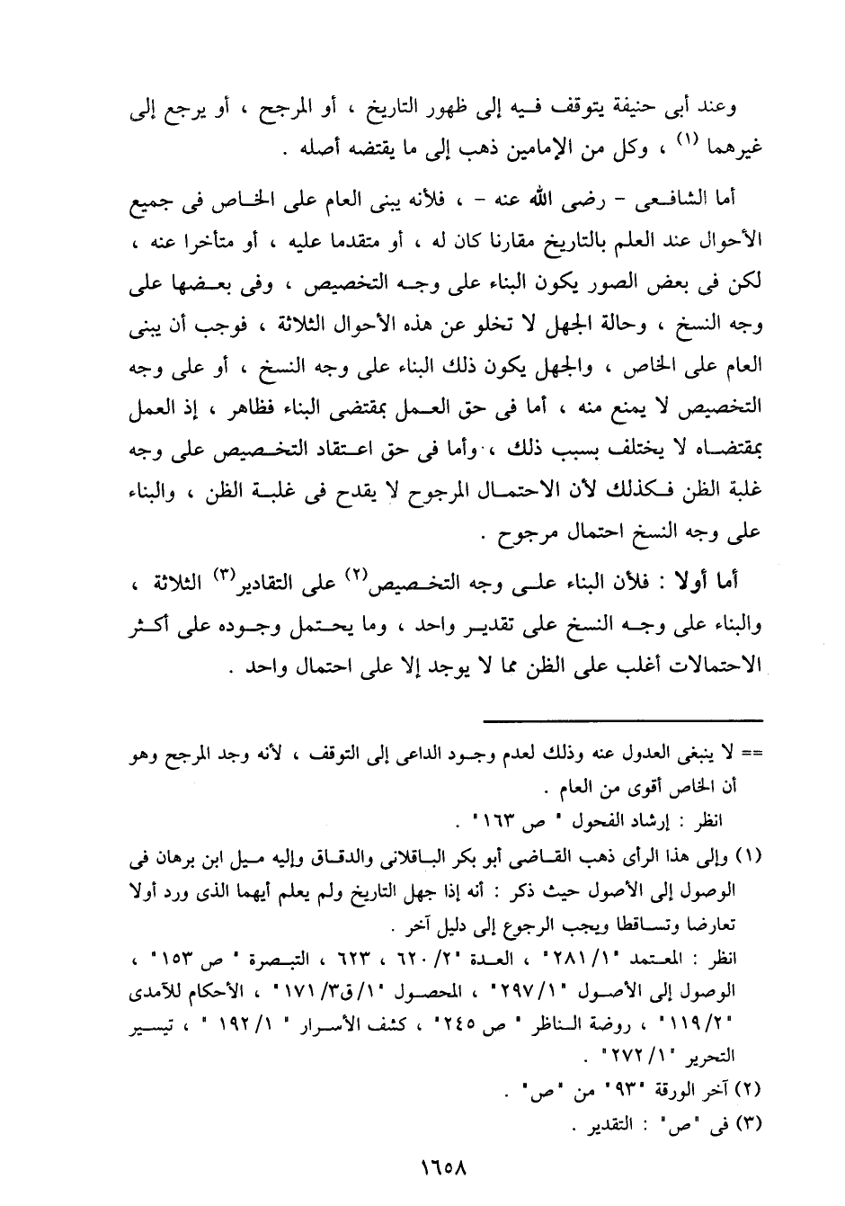 أما الشافعي- رضي الله عنه-، فلأنه يبني العام على الخاص في جميع الأحوال عند العلم بالتاريخ مقارنا كان له، أو متقدما عليه، أو متأخرا عنه، لكن في بعض الصور يكون البناء على وجه التخصيص، وفي بعضها على وجه النسخ، وحالة الجهل لا تخلو عن هذه الأحوال الثلاثة، فوجب أن يبنى العام على الخاص، والجهل يكون ذلك البناء على وجه النسخ، أو على وجه التخصيص لا يمنع منه، أما في حق العمل بمقتضى البناء فظاهر، إذ العمل بمقتضاه لا يختلف بسبب ذلك، وأما في حق اعتقاد التخصيص على وجه غلبة الظن فكذلك لأن الاحتمال المرجوح لا يقدح في غلبة الظن، والبناء على وجه النسخ احتمال مرجوح.