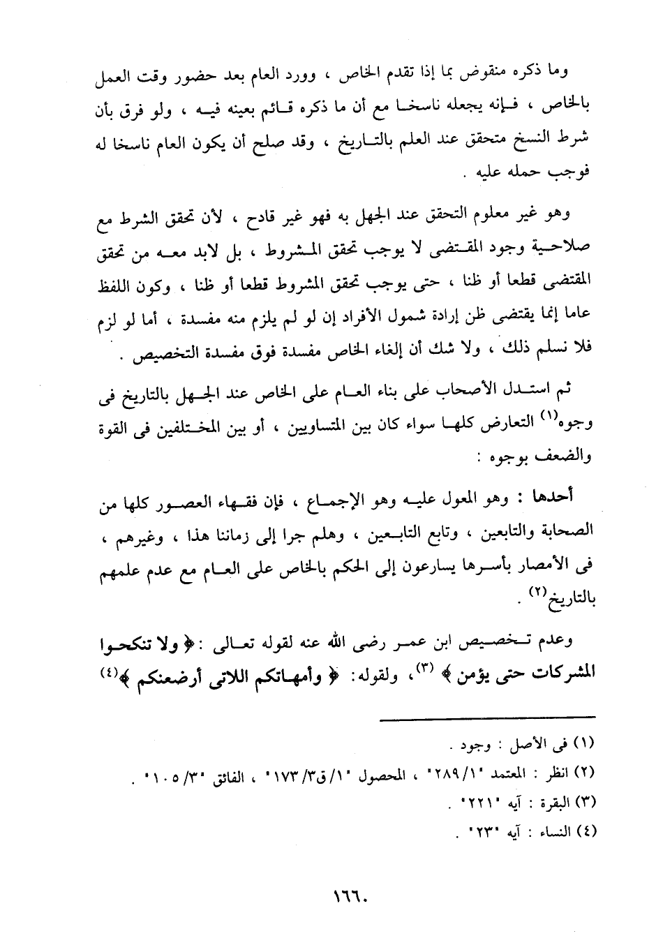 أحدها: وهو المعول عليه وهو الإجماع، فإن فقهاء العصور كلها من الصحابة والتابعين، وتابع التابعين، وهلم جرا إلى زماننا هذا، وغيرهم، في الأمصار بأسرها يسارعون إلى الحكم بالخاص على العام مع عدم علمهم بالتاريخ.