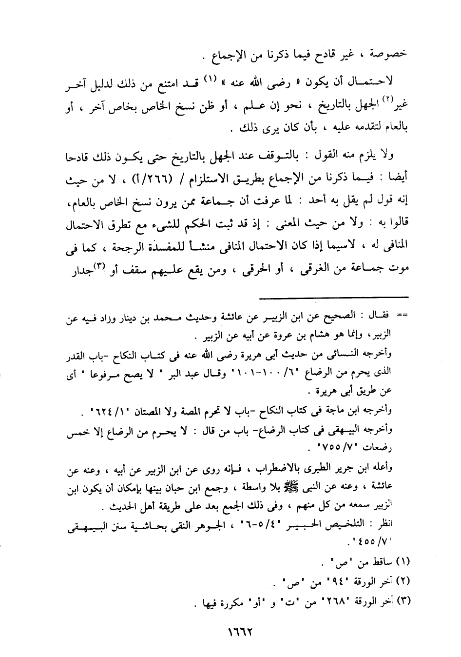 ولا يلزم منه القول: بالتوقف عند الجهل بالتاريخ حتى يكون ذلك قادحا أيضا: فيما ذكرنا من الإجماع بطريق الاستلزام/ (266/ أ)، لا من حيث إنه قول لم يقل به أحد: لما عرفت أن جماعة ممن يرون نسخ الخاص بالعام، قالوا به: ولا من حيث المعنى: إذ قد ثبت الحكم للشيء مع تطرق الاحتمال المنافي له، لاسيما إذا كان الاحتمال المنافي منشأ للمفسدة الرجحة، كما في موت جماعة من الغرقى، أو الحرقى، ومن يقع عليهم سقف أو جدار