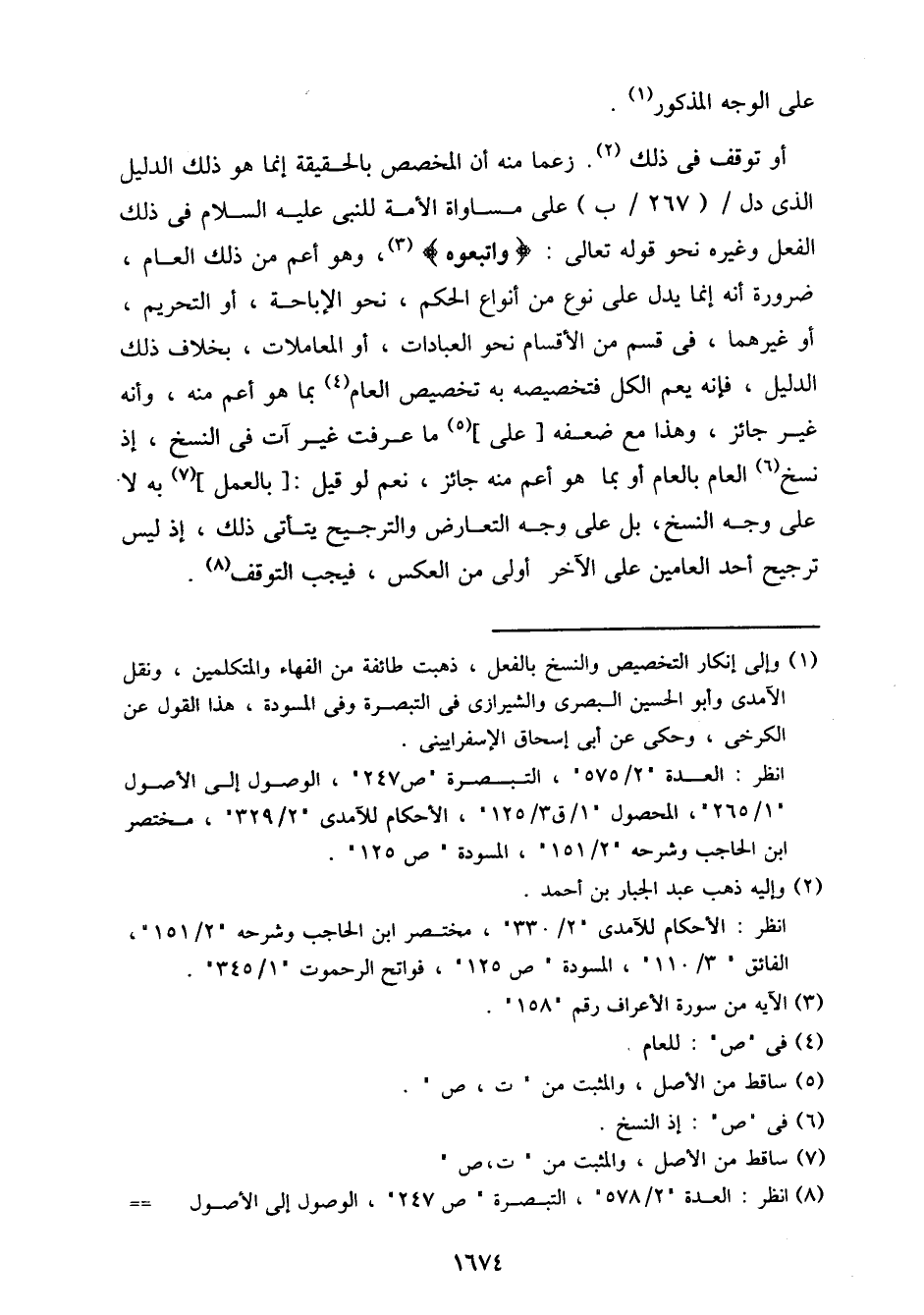 أو توقف في ذلك. زعما منه أن المخصص بالحقيقة إنما هو ذلك الدليل الذي دل/ (267/ ب) على مساواة الأمة للنبي عليه السلام في ذلك الفعل وغيره نحو قوله تعالى: {واتبعوه}، وهو أعم من ذلك العام، ضرورة أنه إنما يدل على نوع من أنواع الحكم، نحو الإباحة، أو التحريم، أو غيرهما، في قسم من الأقسام نحو العبادات، أو المعاملات، بخلاف ذلك الدليل، فإنه يعم الكل فتخصيصه به تخصيص العام بما هو أعم منه، وأنه غير جائز، وهذا مع ضعفه [على] ما عرفت غير آت في النسخ، إذ نسخ العام بالعام أو بما هو أعم منه جائز، نعم لو قيل: [بالعمل] به لا على وجه النسخ، بل على وجه التعارض والترجيح يتأتى ذلك، إذ ليس ترجيح أحد العاملين على الآخر أولى من العكس، فيجب التوقف.