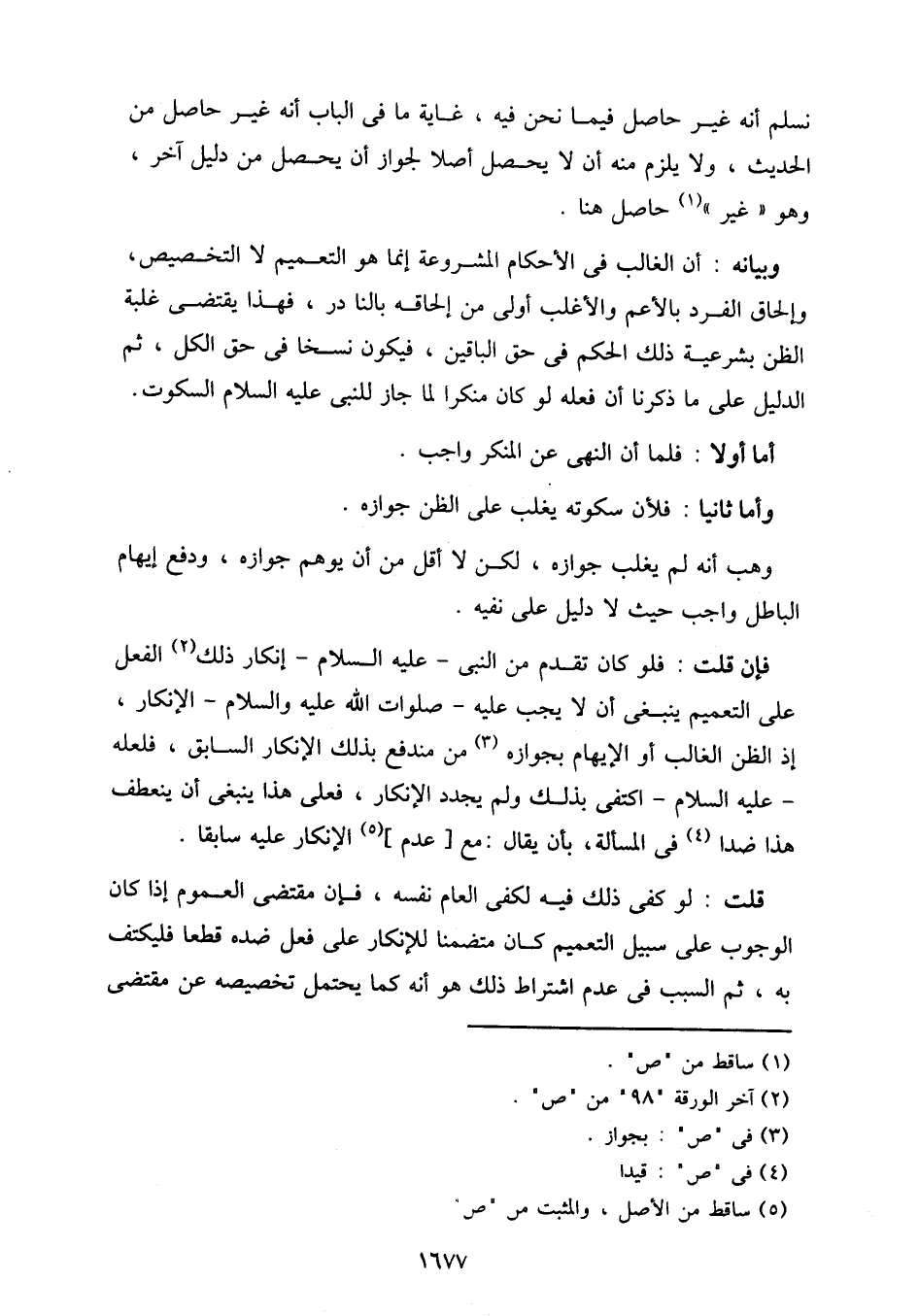 فإن قلت: فلو كان تقدم من النبي- عليه السلام- إنكار ذلك الفعل على التعميم ينبغي أن لا يجب عليه- صلوات الله عليه والسلام- الإنكار، إذ الظن الغالب أو الإيهام بجوازه من مندفع بذلك الإنكار السابق، فلعله- عليه السلام- اكتفى بذلك ولم يجدد الإنكار، فعلى هذا ينبغي أن ينعطف هذا ضدا في المسألة، بأن يقال: مع [عدم] الإنكار عليه سابقا.
