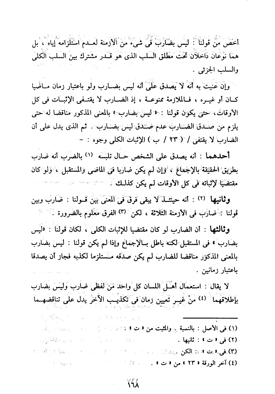 وثالثها: أن الضارب لو كان مقتضيا للإثبات الكلي، لكان قولنا: "ليس بضارب" في المستقبل لكنه باطل بالإجماع وإذا لم يكن قولنا: ليس بضارب بالمعنى المذكور مناقضا للضارب لم يكن صدقه مستلزما لكذبه فجاز أن يصدقا باعتبار زمانين.