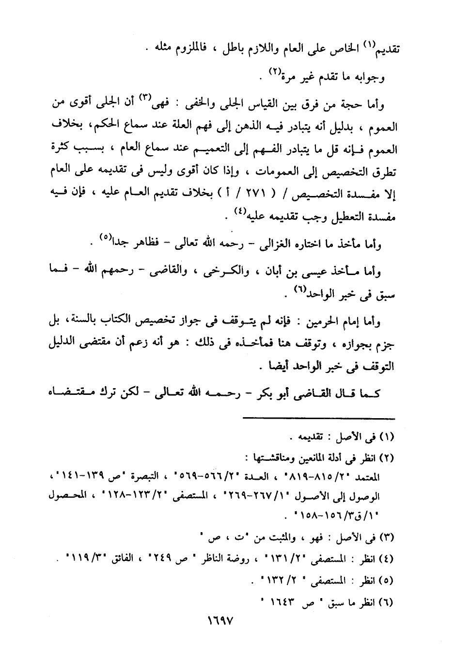 وأما حجة من فرق بين القياس الجلي والخفي: فهي أن الجلي أقوى من العموم، بدليل أنه يتبادر فيه الذهن إلى فهم العلة عند سماع الحكم، بخلاف العموم فإنه قل ما يتبادر الفهم إلى التعميم عند سماع العام، بسبب كثرة تطرق التخصيص إلى العمومات، وإذا كان أقوى وليس في تقديمه على العام إلا مفسدة التخصيص/ (271/ أ) بخلاف تقديم العام عليه، فإن فيه مفسدة التعطيل وجب تقديمه عليه.