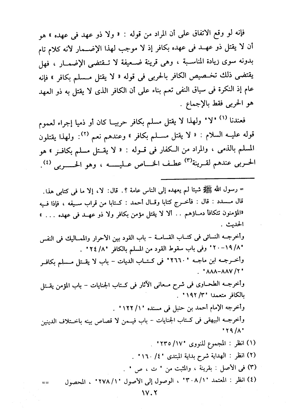 فإنه لو وقع الاتفاق على أن المراد من قوله: "ولا ذو عهد في عهده" هو أن لا يقتل ذو عهد في عهده بكافر إذ لا موجب لهذا الإضمار لأنه كلام تام بدونه سوى زيادة المناسبة، وهي قرينة ضعيفة لا تقتضي الإضمار، فهل يقتضي ذلك تخصيص الكافر بالحربي في قوله "لا يقتل مسلم بكافر" فإنه عام إذ النكرة في سياق النفي تعم بناء على أن الكافر الذي لا يقتل به ذو العهد هو الحربي فقط بالإجماع.