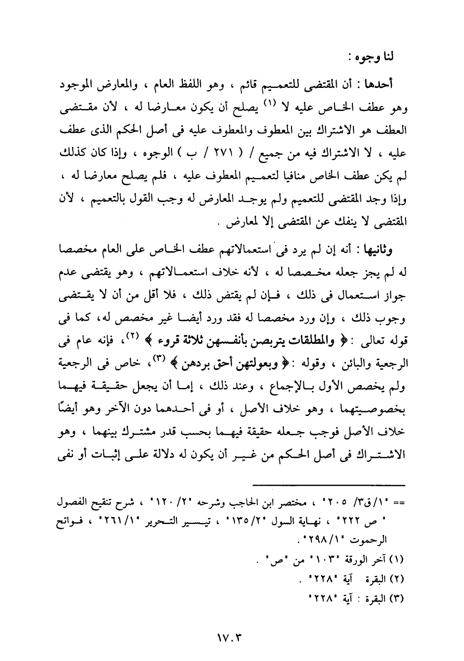 وثانيها: أنه إن لم يرد في استعمالاتهم عطف الخاص على العام مخصصا له لم يجز جعله مخصصا له، لأنه خلاف استعمالاتهم، وهو يقتضي عدم جواز استعمال في ذلك، فإن لم يقتض ذلك، فلا أقل من أن لا يقتضي وجوب ذلك، وإن ورد مخصصا له فقد ورد أيضا غير مخصص له، كما في قوله تعالى: {والمطلقات يتربصن بأنفسهن ثلاثة قروء}، فإنه عام في الرجعية والبائن، وقوله: {وبعولتهن أحق بردهن}، خاص في الرجعية ولم يختص الأول بالإجماع، وعند ذلك، إما أن يجعل حقيقة فيهما بخصوصيتهما، وهو خلاف الأصل، أو في أحدهما دون الآخر وهو أيضًا خلاف الأصل فوجب جعله حقيقة فيهما بحسب قدر مشترك بينهما، وهو الاشتراك في أصل الحكم من غير أن يكون له دلالة على إثبات أو نفي