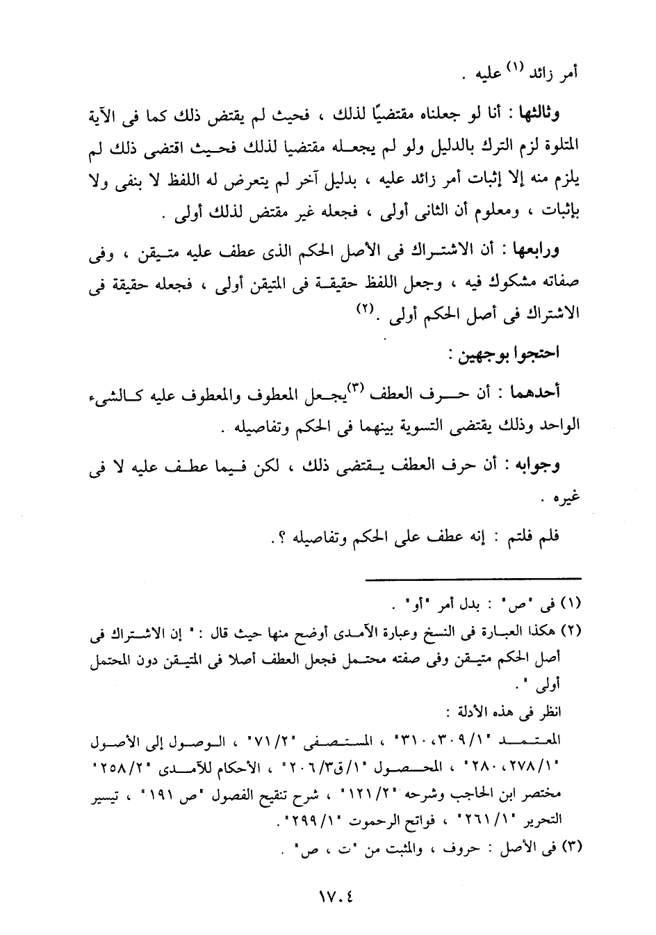ورابعها: أن الاشتراك في الأصل الحكم الذي عطف عليه متيقن، وفي صفاته مشكوك فيه، وجعل اللفظ حقيقة في المتيقن أول، فجعله حقيقة في الاشتراك في أصل الحكم أولى.