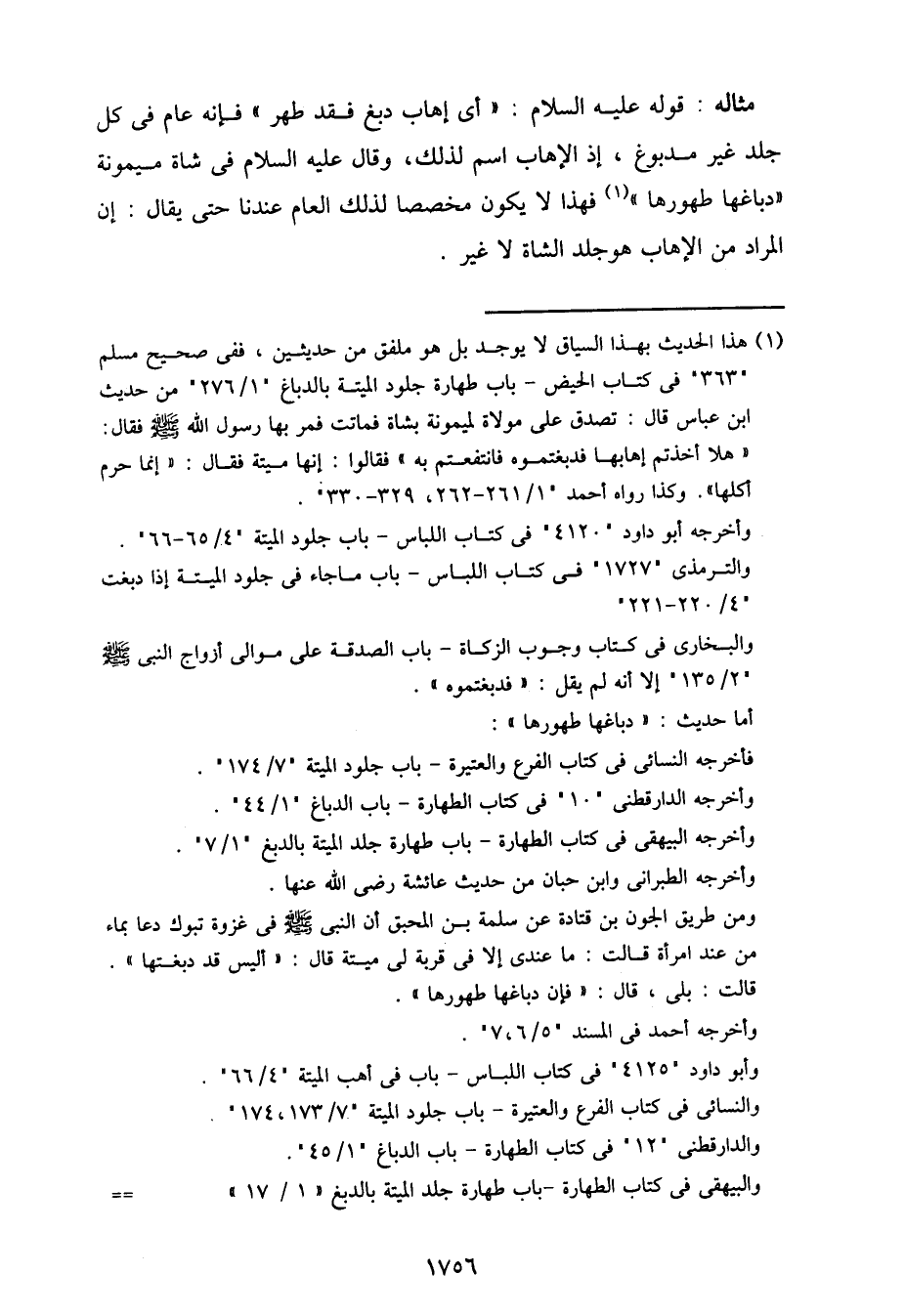مثاله: قوله عليه السلام: "أي إهاب دبغ فقد طهر" فإنه عام في كل جلد غير مدبوغ، إذ الإهاب اسم لذلك، وقال عليه السلام في شاة ميمونة "دباغها طهورها" فهذا لا يكون مخصصا لذلك العام عندنا حتى يقال: إن المراد من الإهاب هو جلد الشاة لا غير.