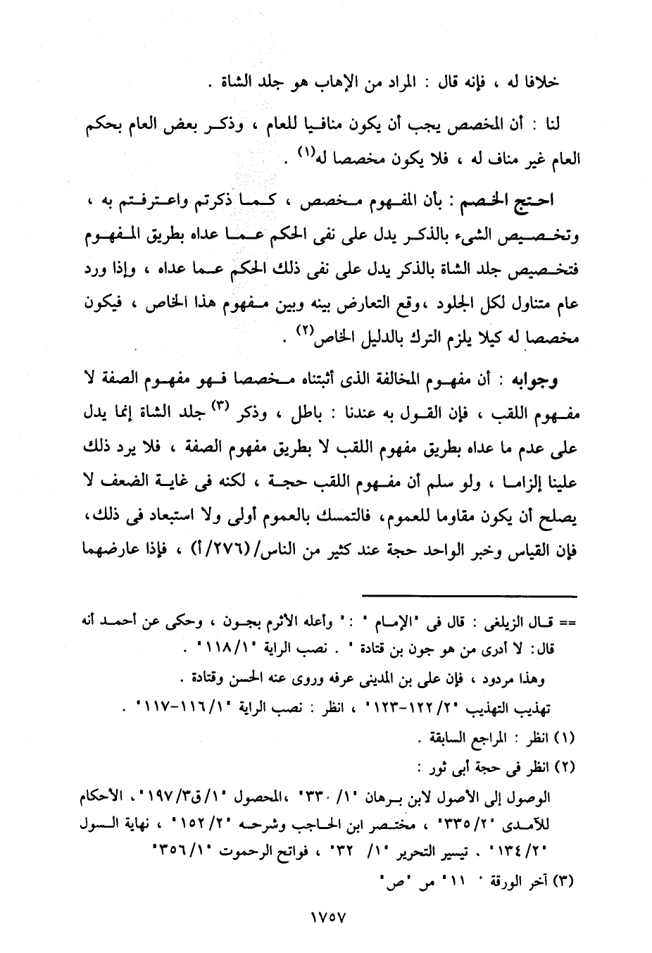 احتج الخصم: بأن المفهوم مخصص، كما ذكرتم واعترفتم به، وتخصيص الشيء بالذكر يدل على نفي الحكم كما عداه بطريق المفهوم فتخصيص جلد الشاة بالذكر يدل على نفي ذلك الحكم عما عداه، وإذا ورد عام متناول لكل الجلود، وقع التعارض بينه وبين مفهوم هذا الخاص، فيكون مخصصا له كيلا يلزم الترك بالدليل الخاص.