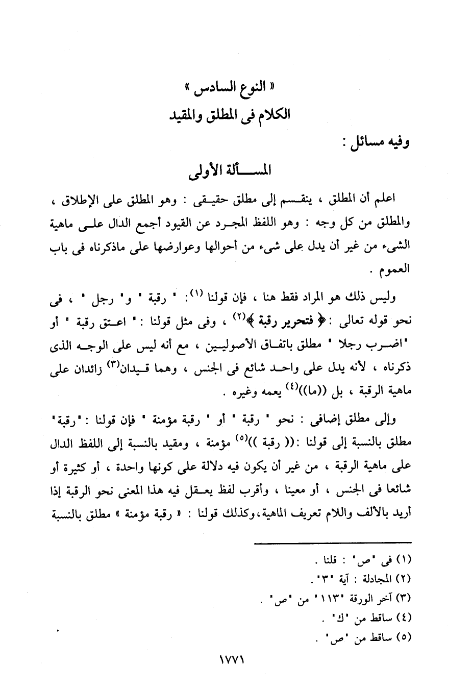 وليس ذلك هو المراد فقط هنا، فإن قولنا: "رقبة" و"رجل"، في نحو قوله تعالى: {فتحرير رقبة}، وفي مثل قولنا: "اعتق رقبة" أو "اضرب رجلا" مطلق باتفاق الأصوليين، مع أنه ليس على الوجه الذي ذكرناه، لأنه يدل على واحد شائع في الجنس، وهما قيدان زائدان على ماهية الرقبة، بل "ما" يعمه وغيره.