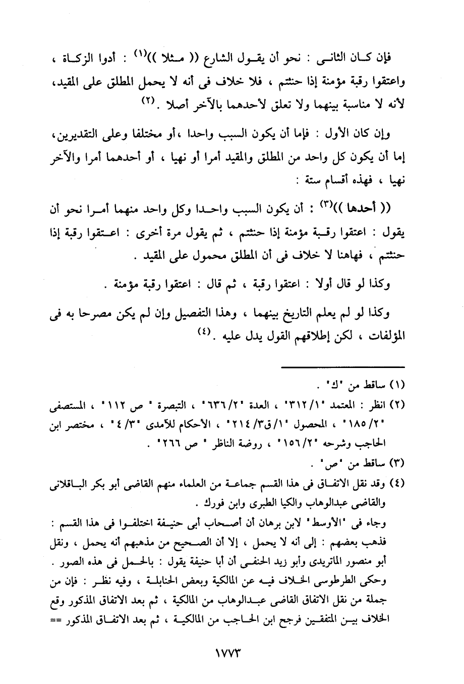 فإن كان الثاني: نحو أن يقول الشارع "مثلا": أدوا الزكاة، واعتقوا رقبة مؤمنة إذا حنثتم، فلا خلاف في أنه لا يحمل المطلق على المقيد، لأنه لا مناسبة بينهما ولا تعلق لأحدهما بالآخر أصلا.