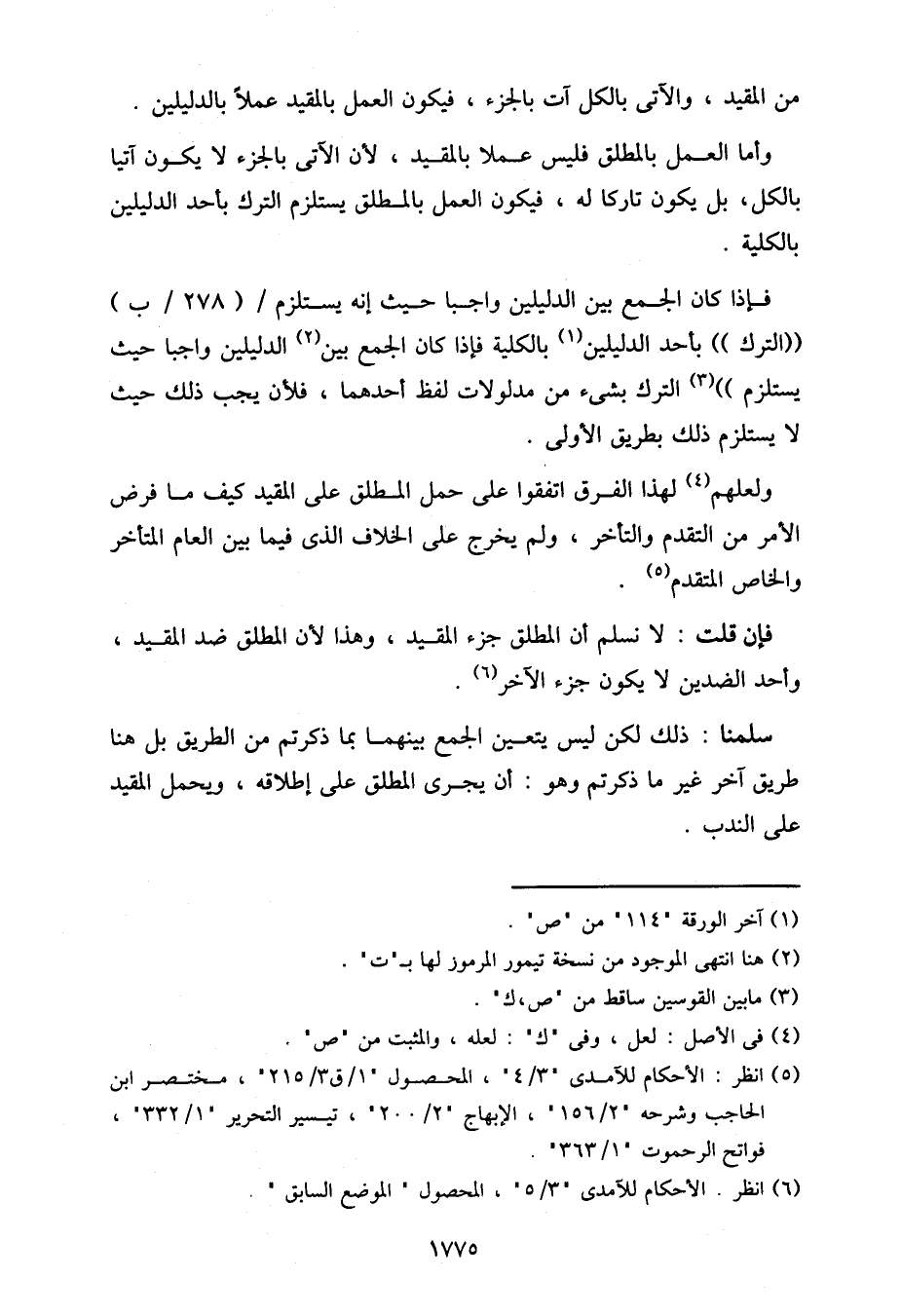 فإذا كان الجمع بين الدليلين واجبا حيث إنه يستلزم/ (278/ ب) "الترك" بأحد الدليلين بالكلية فإذا كان الجمع بين الدليلين واجبا حيث يستلزم" الترك بشيء من مدلولات لفظ أحدهما، فلأن يجب ذلك حيث لا يستلزم ذلك بطريق الأولى.