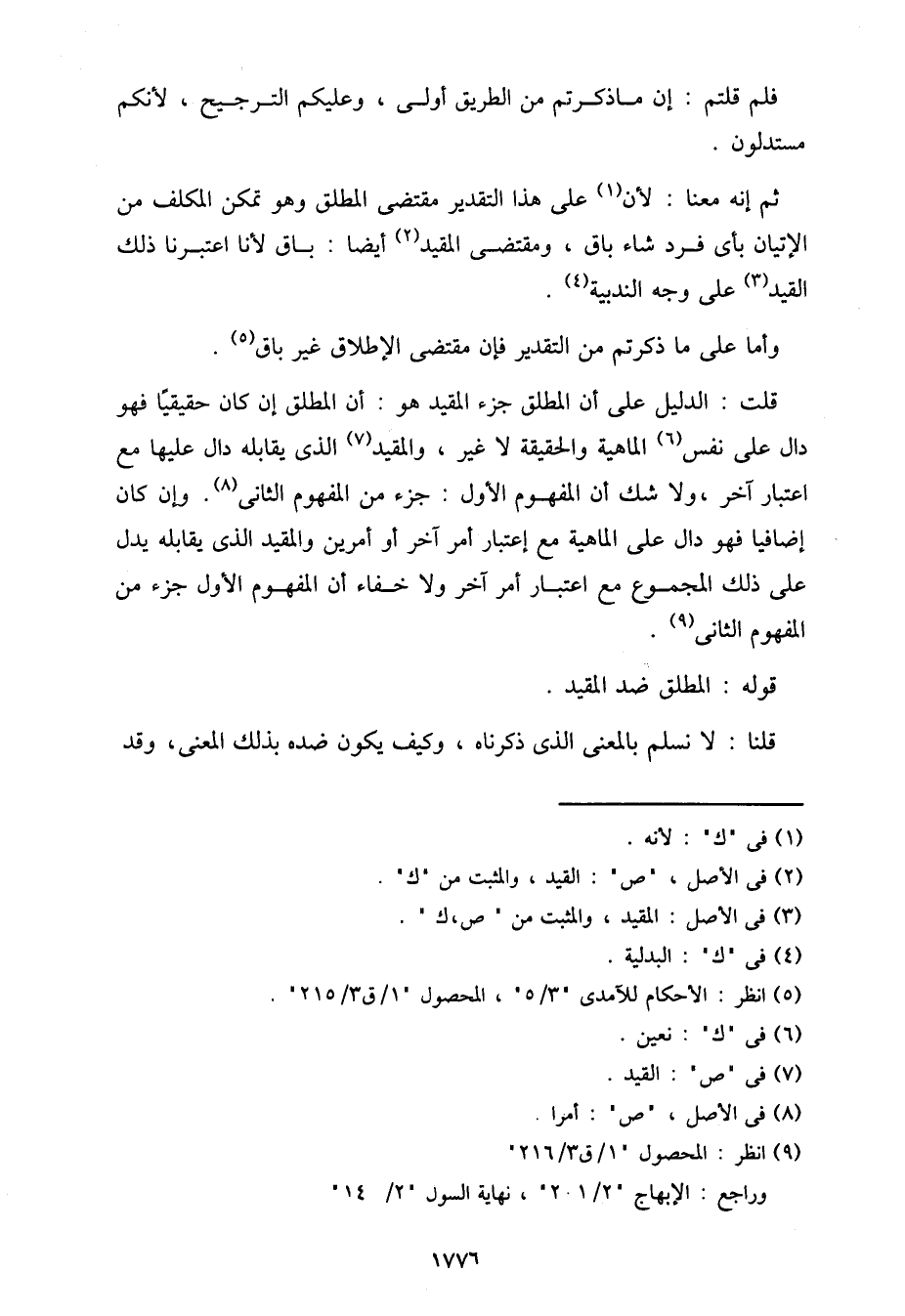 قلت: الدليل على أن المطلق جزء المقيد هو: أن المطلق إن كان حقيقيًا فهو دال على نفس الماهية والحقيقة لا غير، والمقيد الذي يقابله دال عليها مع اعتبار آخر، ولا شك أن المفهوم الأول: جزء من المفهوم الثاني. وإن كان إضافيا فهو دال على الماهية مع اعتبار أمر آخر أو أمرين والمقيد الذي يقابله يدل على ذلك المجموع مع اعتبار أمر آخر ولا خفاء أن المفهوم الأول جزء من المفهوم الثاني.