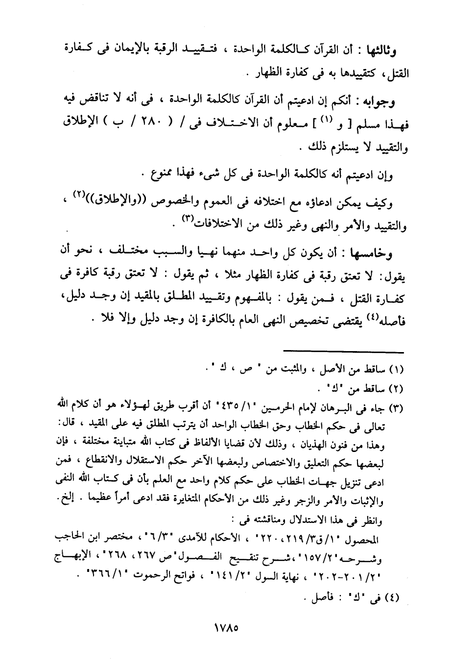 وجوابه: أنكم إن ادعيتم أن القرآن كالكلمة الواحدة، في أنه لا تناقض فيه فهذا مسلم [و] معلوم أن الاختلاف في/ (280/ ب) الإطلاق والتقييد لا يستلزم ذلك.