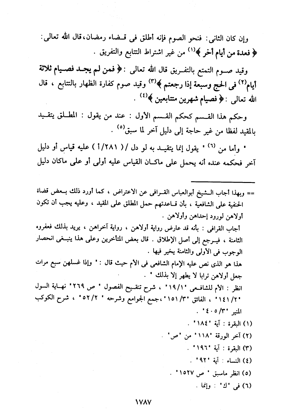 وإن كان الثاني: فنحو الصوم فإنه أطلق في قضاء رمضان، قال الله تعالى: {فعدة من أيام أخر} من غير اشتراط التتابع والتفريق.