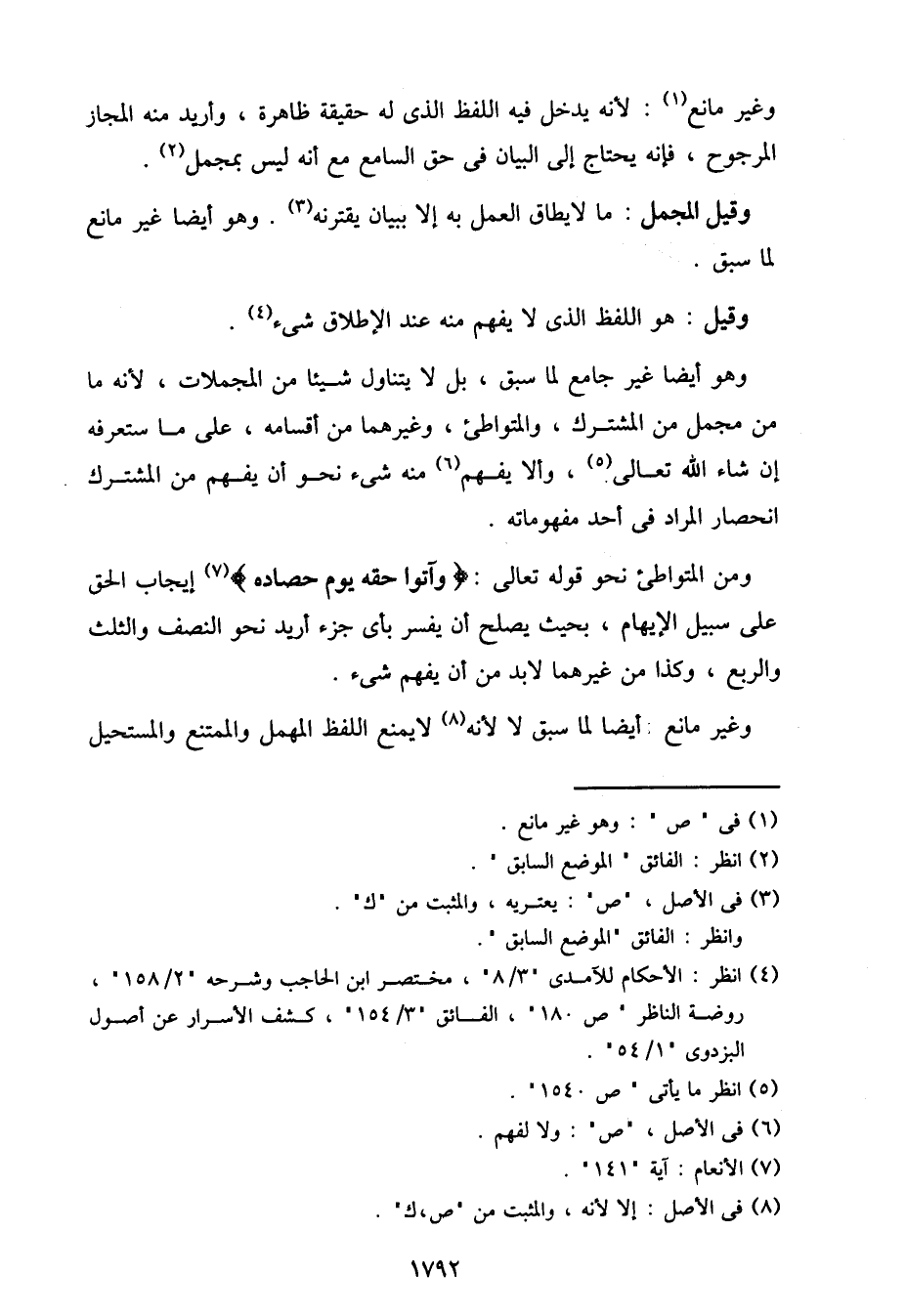 ومن المتواطئ نحو قوله تعالى: {وآتوا حقه يوم حصاده} إيجاب الحق على سبيل الإيهام، بحيث يصلح أن يفسر بأي جزء أريد نحو النصف والثلث والربع، وكذا من غيرهما لابد من أن يفهم شيء.