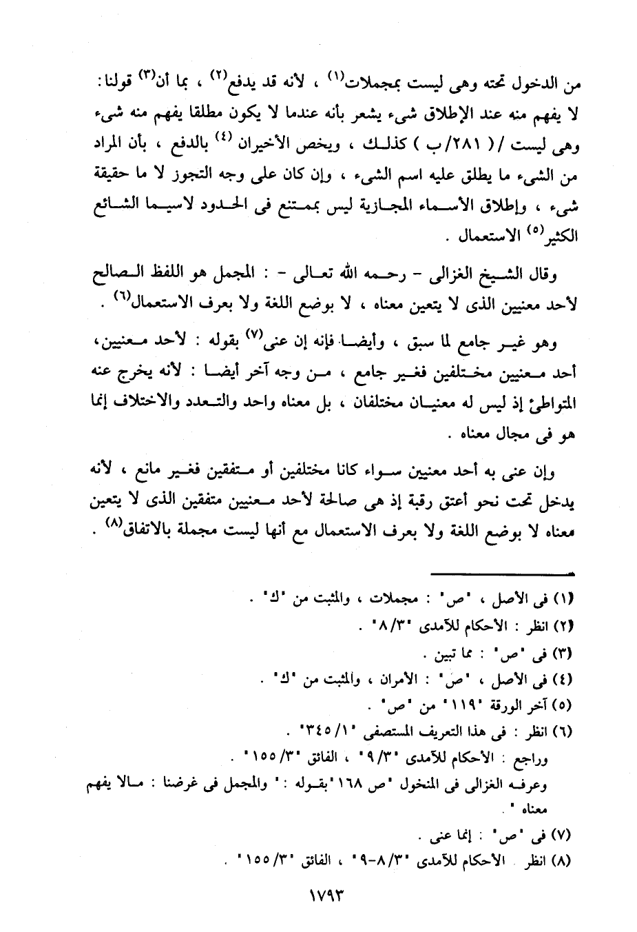 وقال الشيخ الغزالي- رحمه الله تعالى-: المجمل هو اللفظ الصالح لأحد معنيين الذي لا يتعين معناه، لا بوضع اللغة ولا بعرف الاستعمال.