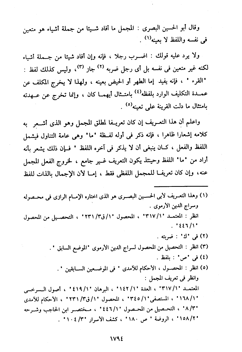 وقال أبو الحسين البصري: المجمل ما أفاد شيئا من جملة أشياء هو متعين في نفسه واللفظ لا بعينه.