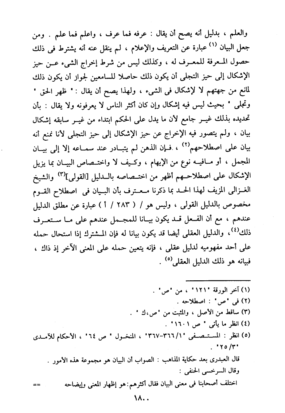 والعلم، بدليل أنه يصح أن يقال: عرفه فما عرف، واعلم فما علم. ومن جعل البيان عبارة عن التعريف والإعلام، لم ينقل عنه أنه يشترط في لك حصول المعرفة للمعرف له، وكذلك ليس من شرط إخراج الشيء عن حيز الإشكال إلى حيز التجلي أن يكون ذلك حاصلا للسامعين لجواز أن يكون ذلك لمانع من جهتهم لا لإشكال في الشيء، ولهذا يصح أن يقال: "ظهر الحق" وتجلى "بحيث ليس فيه إشكال وإن أكثر الناس لا يعرفونه ولا يقال: بأن تحديده بذلك غير جامع لأن ما يدل على الحكم ابتداء من غير سابقه إشكال بيان، ولم يتصور فيه الإخراج عن حيز الإشكال إلى حيز التجلي لأنا نمنع أنه بيان على اصطلاحهم، فإن الذهن لم يتبادر عند سماعه إلا إلى بيان المجمل، أو ما فيه نوع من الإيهام، وكيف لا واختصاص البيان بما يزيل الإشكال على اصطلاحهم أظهر من اختصاصه بالدليل [القولي] والشيخ الغزالي المزيف لهذا الحد بما ذكرنا معترف بأن البيان في اصطلاح القوم مخصوص بالدليل القولي، وليس هو/ (283/ أ) عبارة عن مطلق الدليل عندهم، مع أن الفعل قد يكون بيانا للمجمل عندهم على ما ستعرف ذلك، والدليل العقلي أيضا قد يكون بيانا له فإن المشترك إذا استحال حمله على أحد مفهوميه لدليل عقلي، فإنه يتعين حمله على المعنى الآخر إذ ذاك، فبيانه هو ذلك الدليل العقلي.