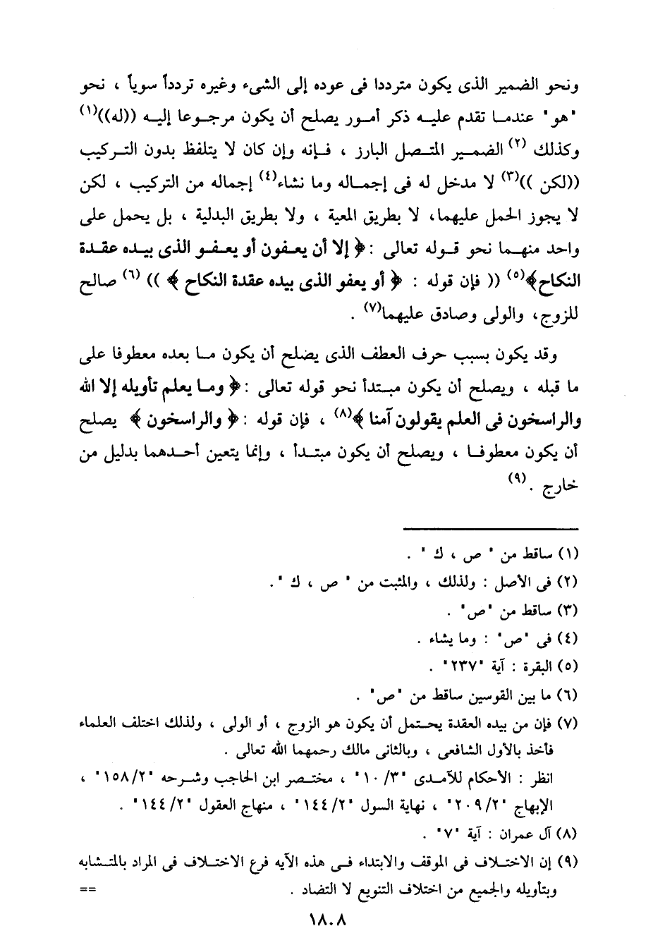 ونحو الضمير الذي يكون مترددا في عوده إلى الشيء وغير ترددا سويًا، نحو "هو" عندما تقدم عليه ذكر أمور يصلح أن يكون مرجوعا إليه "له" وكذلك الضمير المتصل البارز، فإنه وإن كان لا يتلفظ بدون التركيب "لكن" لا مدخل له في إجماله وما نشاء إجماله من التركيب، لكن لا يجوز الحمل عليهما، لا بطريق المعية، ولا بطريق البدلية، بل يحمل على واحد منهما نحو قوله تعالى: {إلا أن يعفون أو يعفو الذي بيده عقدة النكاح} "فإن قوله: {أو يعفو الذي بيده عقدة النكاح} " صالح للزوج، والولي وصادق عليهما.
