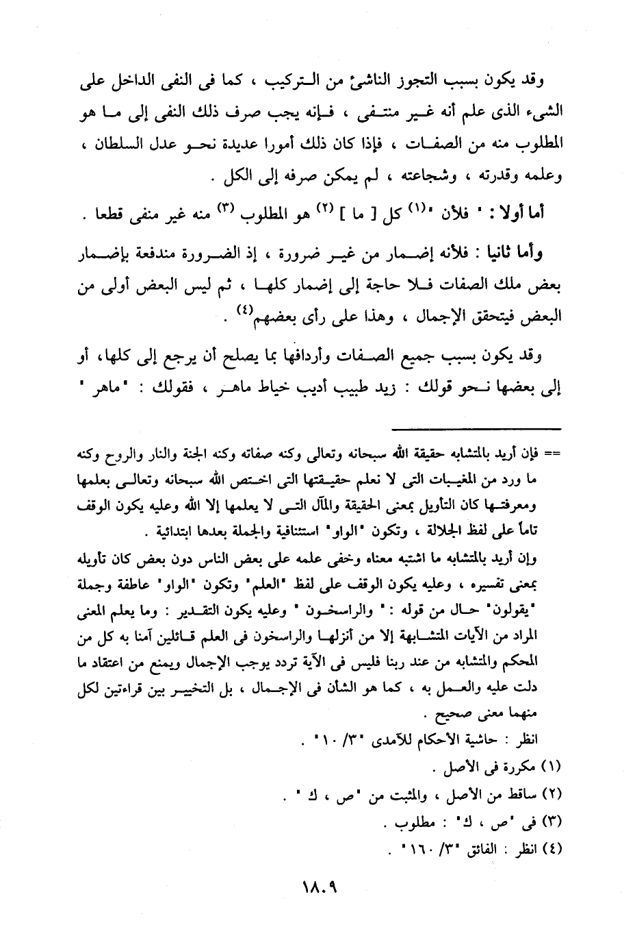 وأما ثانيا: فلأنه إضمار من غير ضرورة، إذ الضرورة مندفعة بإضمار بعض ملك الصفات فلا حاجة إلى إضمار كلها، ثم ليس البعض أولى من البعض فيتحقق الإجمال، وهذا على رأي بعضهم.