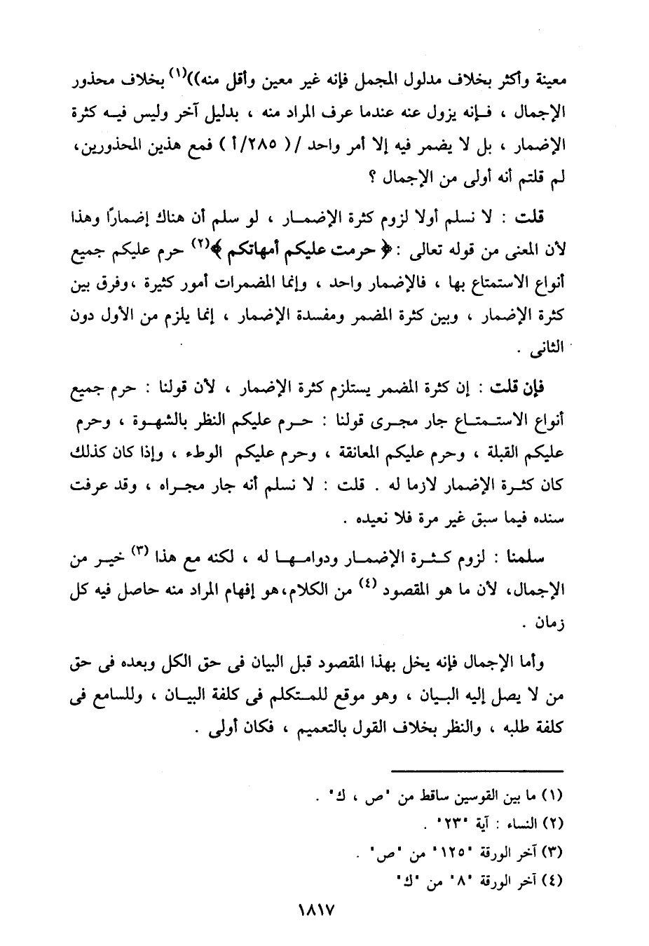 وأما الإجمال فإنه يخل بهذا المقصود قبل البيان في حق الكل وبعده في حق من لا يصل إليه البيان، وهو موقع للمتكلم في كلفة البيان، وللسامع في كلفة طلبه، والنظر بخلاف القول بالتعميم، فكان أولى.