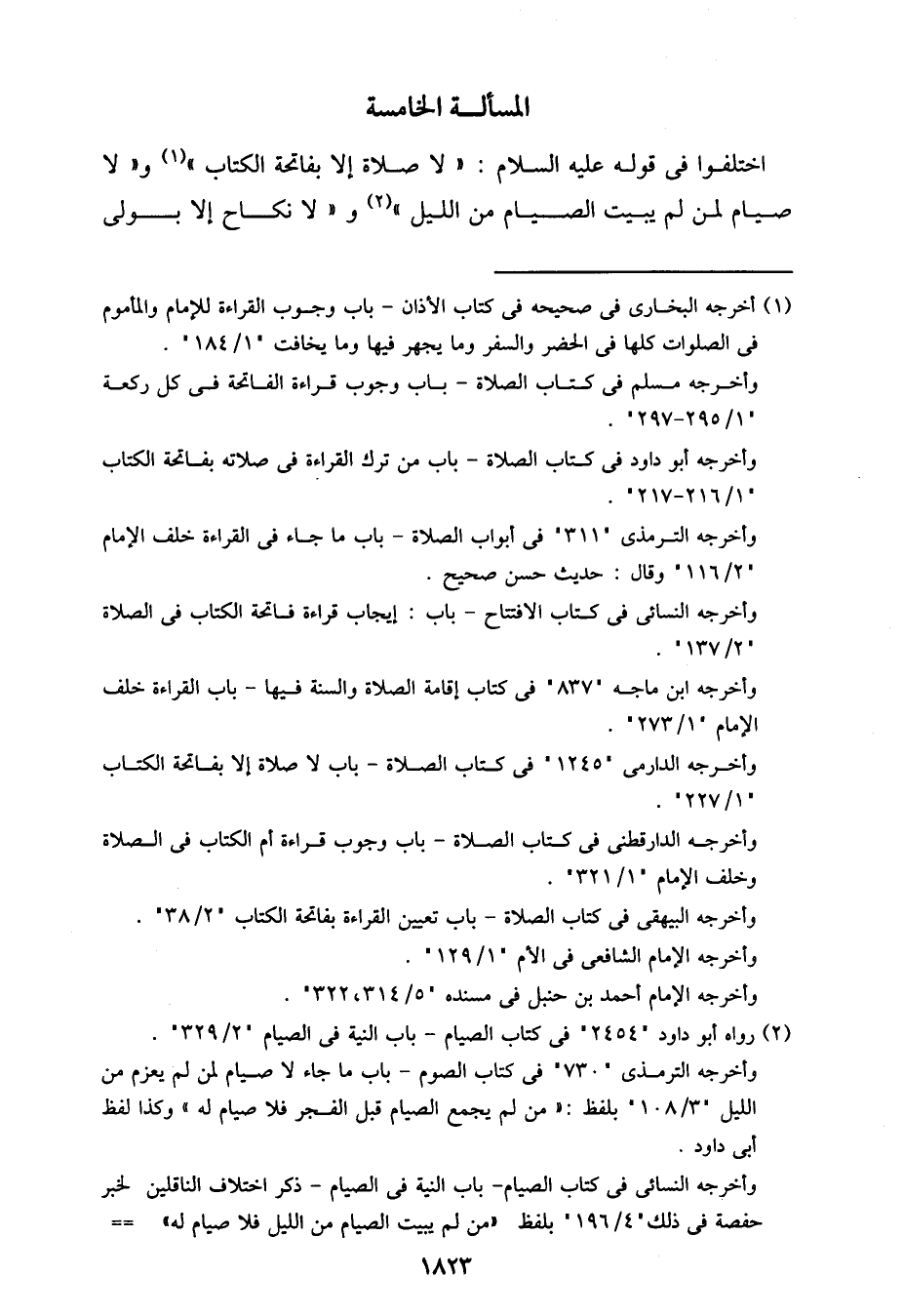اختلفوا في قوله عليه السلام: "لا صلاة إلا بفاتحة الكتاب" و"لا صيام لمن لم يبيت الصيام من الليل" و"لا نكاح إلا بولي