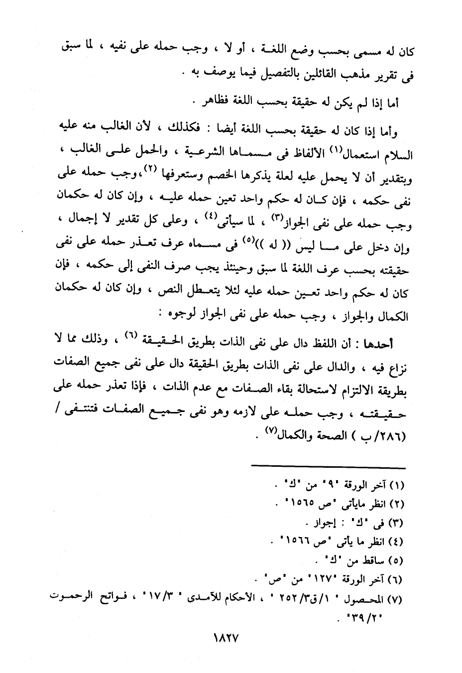 أحدها: أن اللفظ دال على نفي الذات بطريق الحقيقة، وذلك مما لا نزاع فيه، والدال على نفي الذات بطريق الحقيقة دال على نفي جميع الصفات بطريقة الالتزام لاستحالة بقاء الصفات مع عدم الذات، فإذا تعذر حمله على حقيقته، وجب حمله على لازمه وهو نفي جميع الصفات فتنتفي/ (286/ ب) الصحة والكمال.