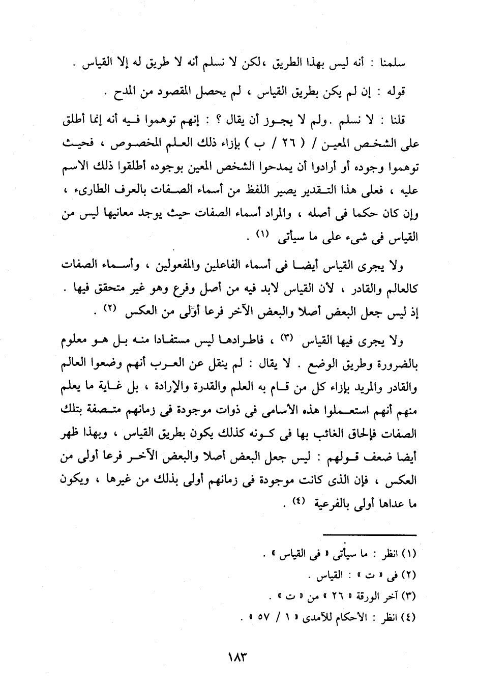 ولا يجرى فيها القياس، فاطرادها ليس مستفادا منه بل هو معلوم بالضرورة وطريق الوضع. لا يقال: لم ينقل عن العرب أنهم وضعوا العالم والقادر والمريد بإزاء كل من قام به العلم والقدرة والإرادة، بل غاية ما يعلم منهم أنهم استعملوا هذه الأسامي في ذوات موجودة في زمانهم متصفة بتلك الصفات فإلحاق الغائب بها في كونه كذلك يكون بطريق القياس، وبهذا ظهر أيضا ضعف قولهم: ليس جعل البعض أصلا والبعض الآخر فرعا أولى من العكس، فإن الذي كانت موجودة في زمانهم أولى بذلك من غيرها، ويكون ما عداها أولى بالفرعية.