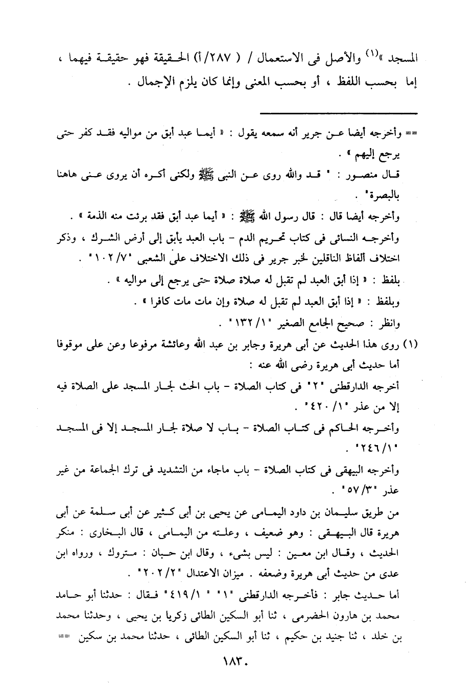 المسجد" والأصل في الاستعمال/ (287/ أ) الحقيقة فهو حقيقة فيهما، إما بحسب اللفظ، أو بحسب المعنى وإنما كان يلزم الإجمال.