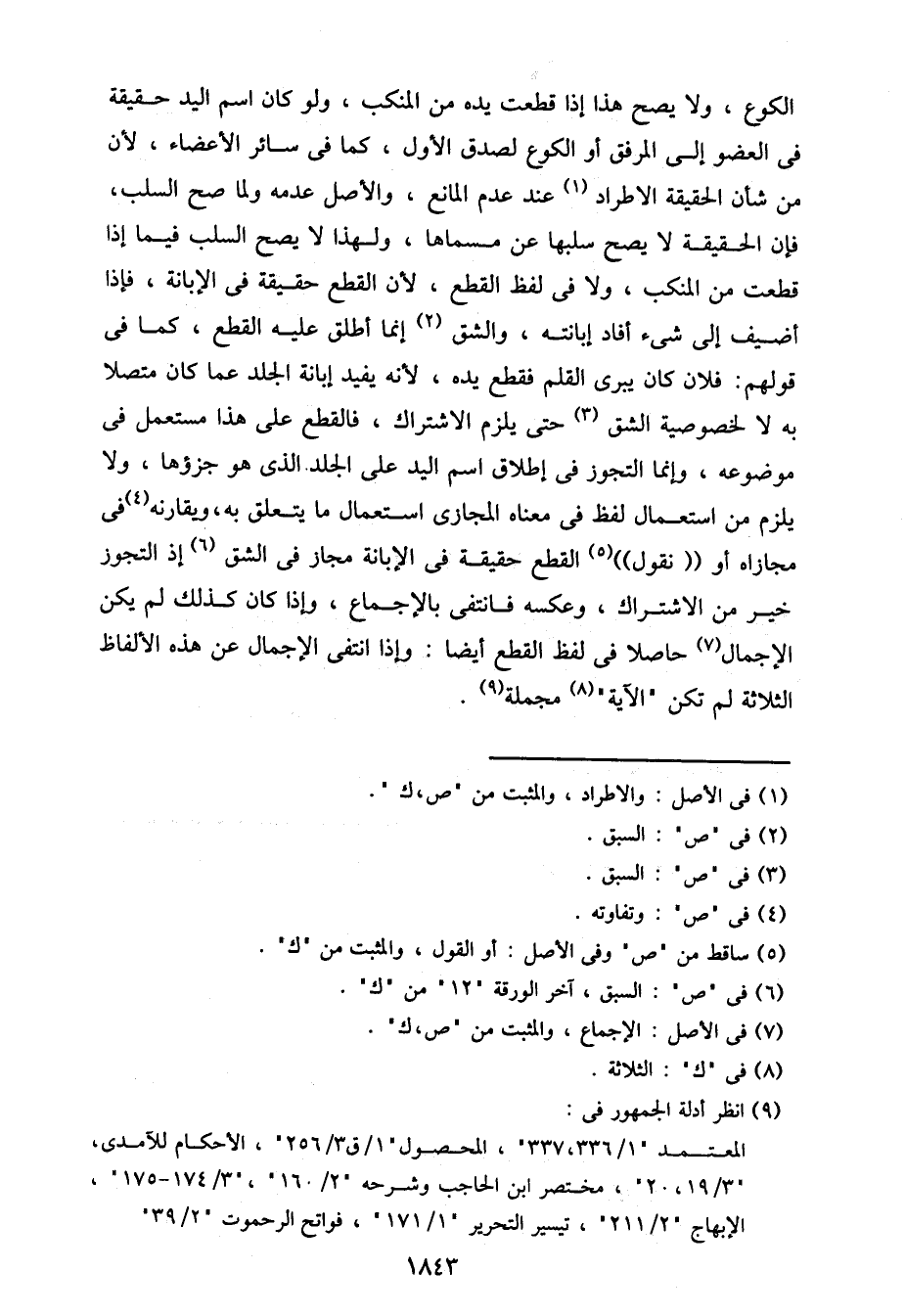 الكوع، ولا يصح هذا إذا قطعت يده من المنكب، ولو كان اسم اليد حقيقة في العضو إلى المرفق أو الكوع لصدق الأول، كما في سائر الأعضاء، لأن من شأن الحقيقة الاطراد عند عدم المانع، والأصل عدمه ولما صح السلب، فإن الحقيقة لا يصح سلبها عن مسماها، ولهذا لا يصح السلب فيما إذا قطعت من المنكب، ولا في لفظ القطع، لأن القطع حقيقة في الإبانة، فإذا أضيف إلى شيء أفاد إبانته، والشق إنما أطلق عليه القطع، كما في قولهم: فلان كان يبري القلم فقطع يده، لأنه يفيد إبانة الجلد عما كان متصلا به لا لخصوصية الشق حتى يلزم الاشتراك، فالقطع على هذا مستعمل في موضوعه، وإنما التجوز في إطلاق اسم اليد على الجلد الذي هو جزؤها، ولا يلزم من استعمال لفظ في معناه المجازي استعمال ما يتعلق به، ويقارنه في مجازاه أو "نقول" القطع حقيقة في الإبانة مجاز في الشق إذ التجوز خير من الاشتراك، وعكسه فانتفى بالإجماع، وإذا كان كذلك لم يكن الإجمال حاصلا في لفظ القطع أيضا: وإذا انتفى الإجمال عن هذه الألفاظ الثلاثة لم تكن "الآية" مجملة.