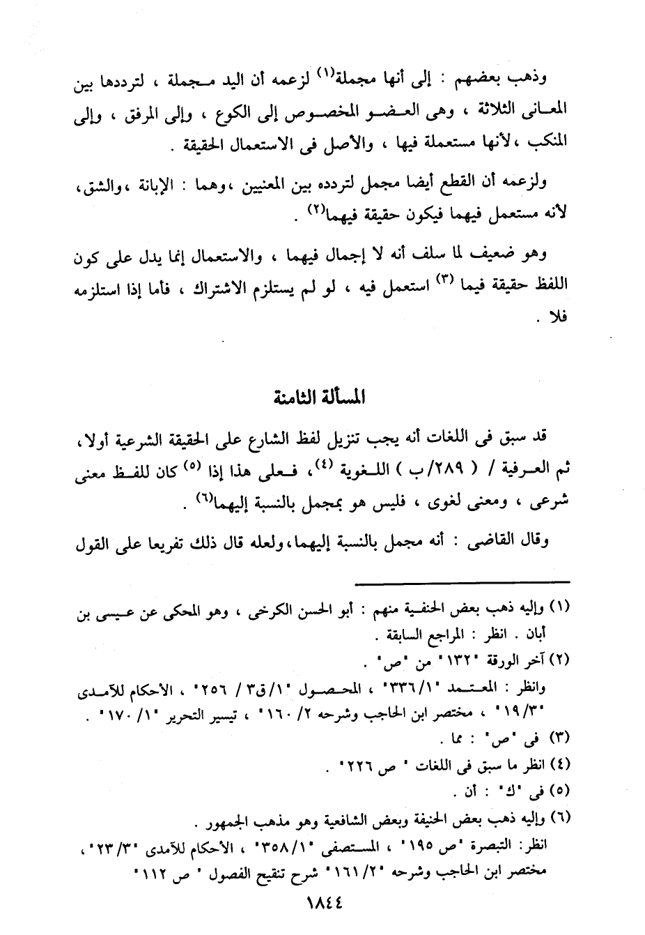 وذهب بعضهم: إلى أنها مجملة لزعمه أن اليد مجملة، لترددها بين المعاني الثلاثة، وهي العضو المخصوص إلى الكوع، وإلى المرفق، وإلى المنكب، لأنها مستعملة فيها، والأصل في الاستعمال الحقيقة.
