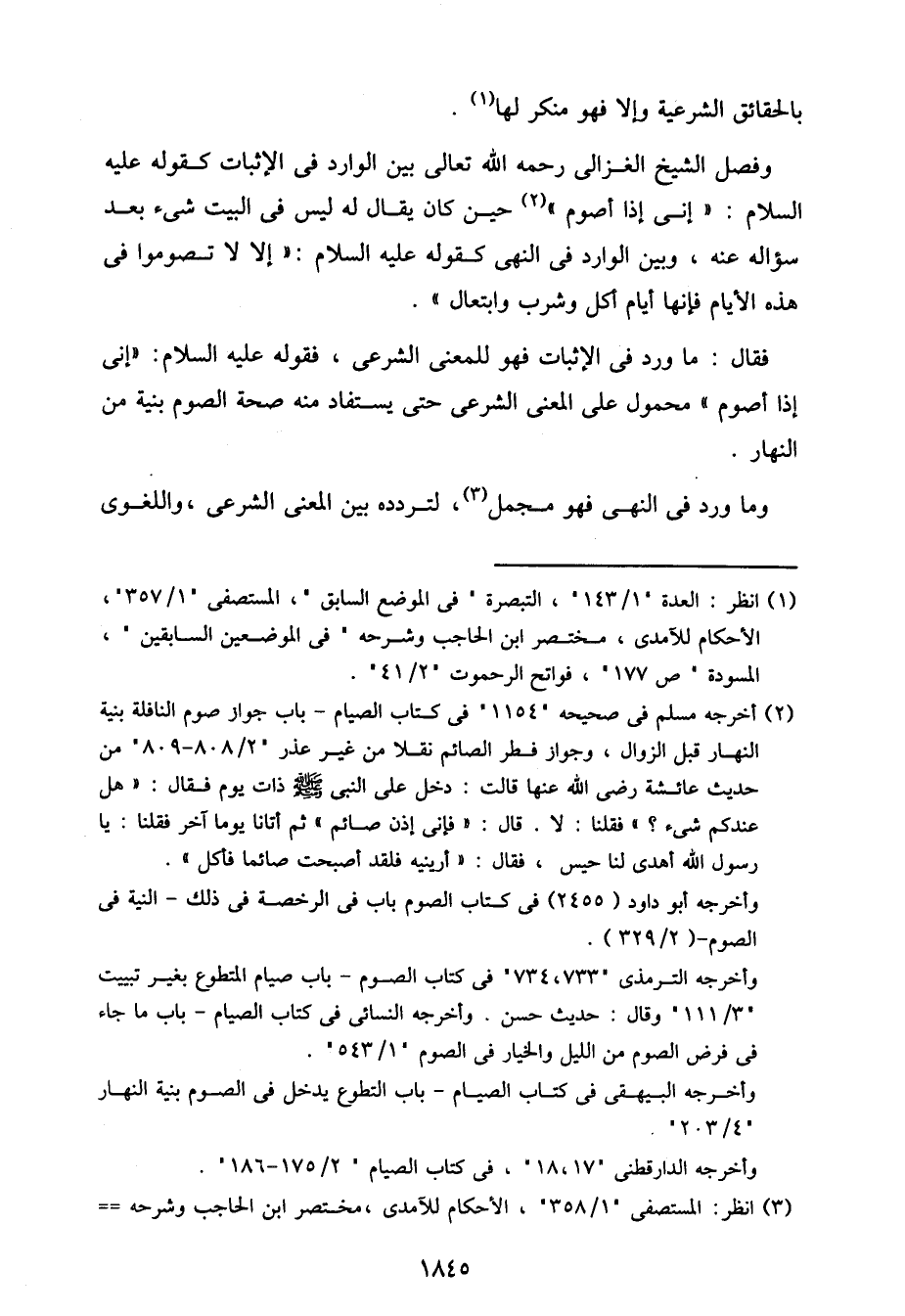 وفصل الشيخ الغزالي رحمه الله تعالى بين الوارد في الإثبات كقوله عليه السلام: "إني إذا أصوم" حين كان يقال له ليس في البيت شيء بعد سؤاله عنه، وبين الوارد في النهي كقوله عليه السلام: "إلا لا تصوموا في هذه الأيام فإنها أيام أكل وشرب وابتعال".