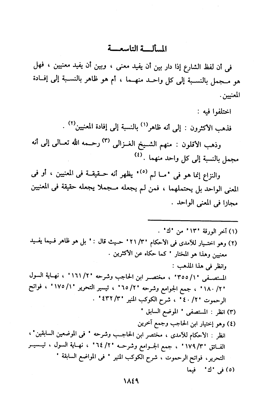 في أن لفظ الشارع إذا دار بين أن يفيد معنى، وبين أن يفيد معنيين، فهل هو مجمل بالنسبة إلى كل واحد منهما، أم هو ظاهر بالنسبة إلى إفادة المعنيين.