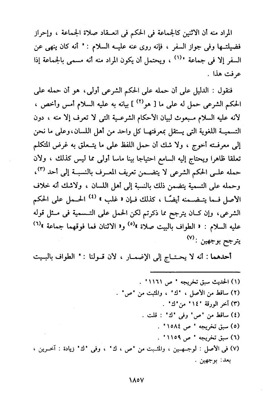 فنقول: الدليل على أن حمله على الحكم الشرعي أولى، هو أن حمله على الحكم الشرعي حمل له على ما [هو] بيانه به عليه السلام أمس وأخص، لأنه عليه السلام مبعوث لبيان الأحكام الشرعية التي لا تعرف إلا منه، دون التسمية اللغوية التي يستقل بمعرفتها كل واحد من أهل اللسان، وعلى ما نحن إلى معرفته أحوج، ولا شك أن حمل اللفظ على ما يتعلق به غرض المتكلم تعلقا ظاهرا ويحتاج إليه السامع احتياجا بينا ماسا أولى مما ليس كذلك، ولأن حمله على الحكم الشرعي لا يتضمن تعريف المعرف بالنسبة إلى أحد، وحمله على التسمية يتضمن ذلك بالنسبة إلى أهل اللسان، ولا شك أنه خلاف الأصل فما يتضمنه أيضًا، كذلك فإن "غلب" الحمل على الحكم الشرعي، وإن كان يترجح مما ذكرتم لكن الحمل على التسمية في مثل قوله عليه السلام: "الطواف بالبيت صلاة" و"الاثنان فما فوقهما جماعة" يترجح بوجهين: