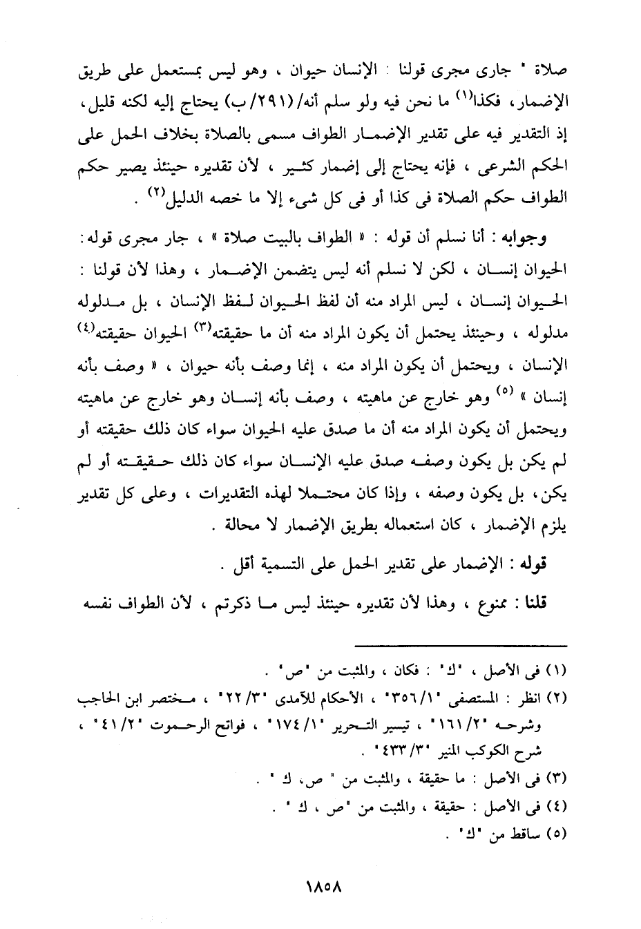 وجوابه: أنا نسلم أن قوله: "الطواف بالبيت صلاة"، جار مجرى قوله: الحيوان إنسان، لكن لا نسلم أنه ليس يتضمن الإضمار، وهذا لأن قولنا: الحيوان إنسان، ليس المراد منه أن لفظ الحيوان لفظ الإنسان، بل مدلوله مدلوله، وحينئذ يحتمل أن يكون المراد منه أن ما حقيقته الحيوان حقيقته الإنسان، ويحتمل أن يكون المراد منه، إنما وصف بأنه حيوان، "وصف بأنه إنسان" وهو خارج عن ماهيته، وصف بأنه إنسان وهو خارج عن ماهيته ويحتمل أن يكون المراد منه أن ما صدق عليه الحيوان سواء كان ذلك حقيقته أو لم يكن بل يكون وصفه صدق عليه الإنسان سواء كان ذلك حقيقته أو لم يكن، بل يكون وصفه، وإذا كان محتملا لهذه التقديرات، وعلى كل تقدير يلزم الإضمار، كان استعماله بطريق الإضمار لا محالة.