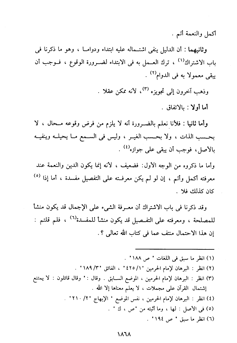 وأما ما ذكروه من الوجه الأول: فضعيف، لأنه إنما يكون الدين والنعمة عند معرفته أكمل وأتم، إن لو لم يكن معرفته على التفصيل مفسدة، أما إذا كان كذلك فلا.