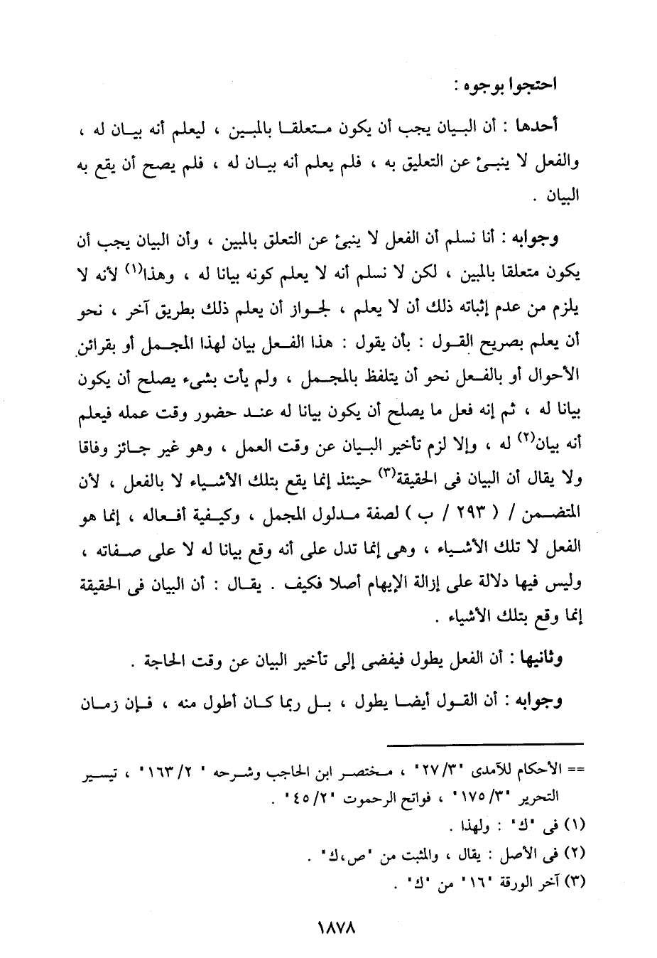 وثانيها: أن الفعل يطول فيفضي إلى تأخير البيان عن وقت الحاجة.