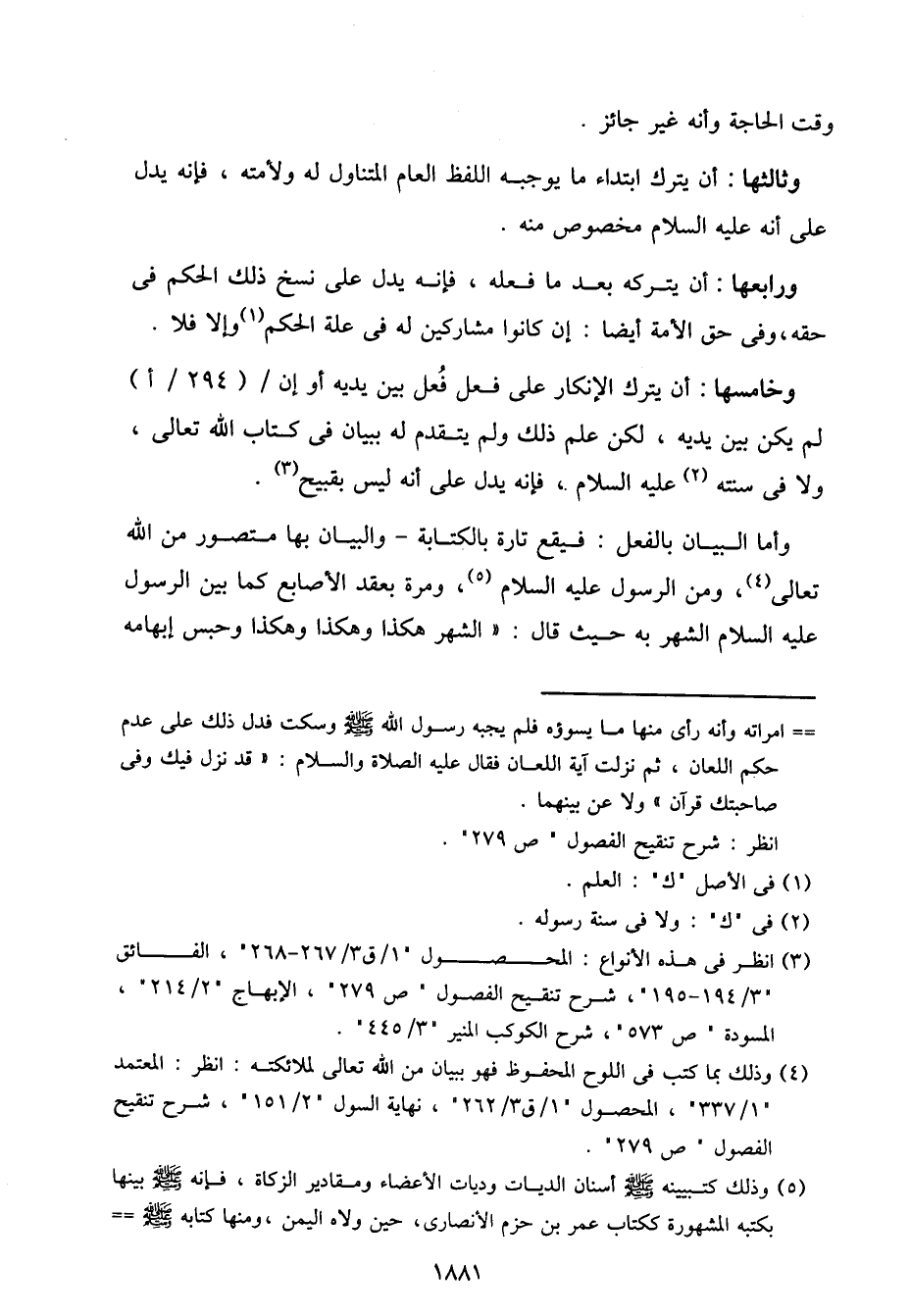 وخامسها: أن يترك الإنكار على فعل فُعل بين يديه أو إن / (294/أ) لم يكن بين يديه، لكن علم ذلك ولم يتقدم له ببيان في كتاب الله تعالى، ولا في سنته عليه السلام، فإنه يدل على أنه ليس بقبيح.