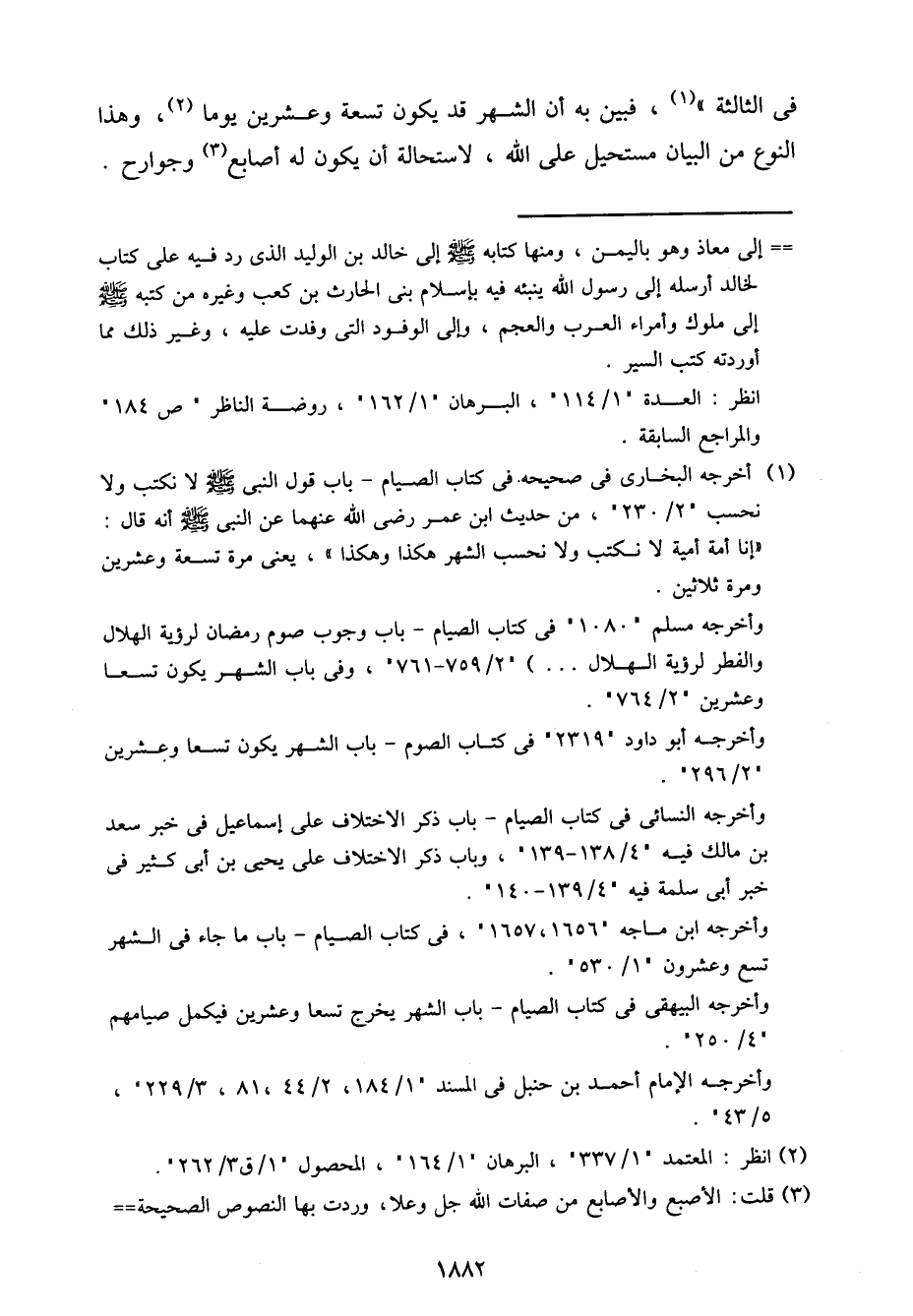 في الثالثة"، فبين به أن الشهر قد يكون تسعة وعشرين يوما، وهذا النوع من البيان مستحيل على الله، لاستحالة أن يكون له أصابع وجوارح.