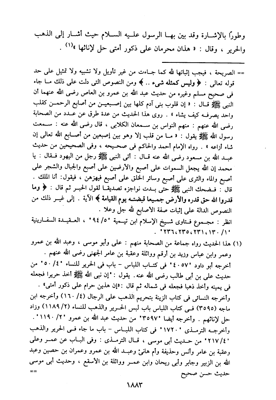 وطورًا بالإشارة وقد بين بها الرسول عليه السلام حيث أشار إلى الذهب والحرير، وقال: "هذان محرمان على ذكور أمتي حل لإناثها".