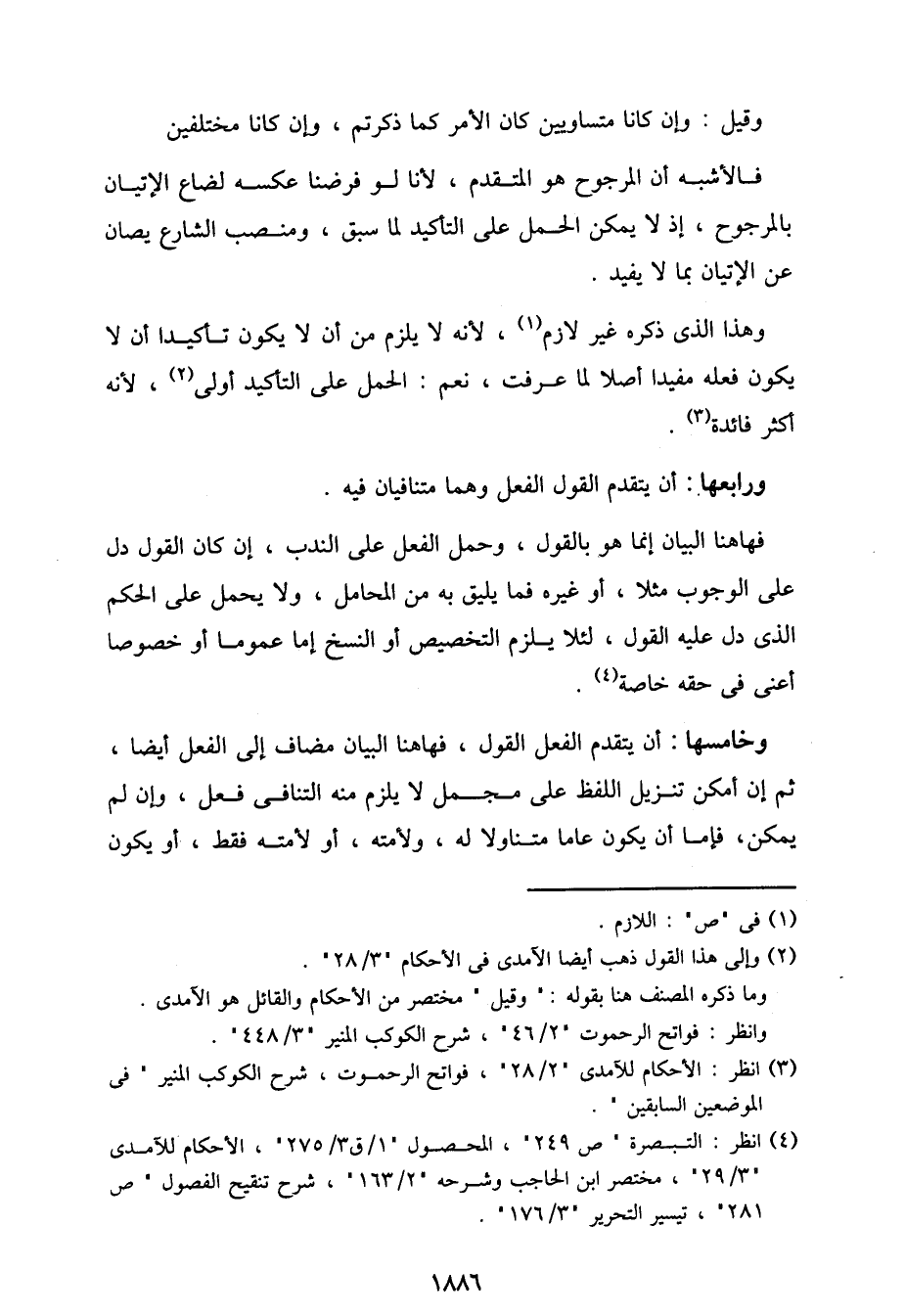 فالأشبه أن المرجوح هو المتقدم، لأنا لو فرضنا عكسه لضاع الإتيان بالمرجوح، إذ لا يمكن الحمل على التأكيد لما سبق، ومنصب الشارع يصان عن الإتيان بما لا يفيد.