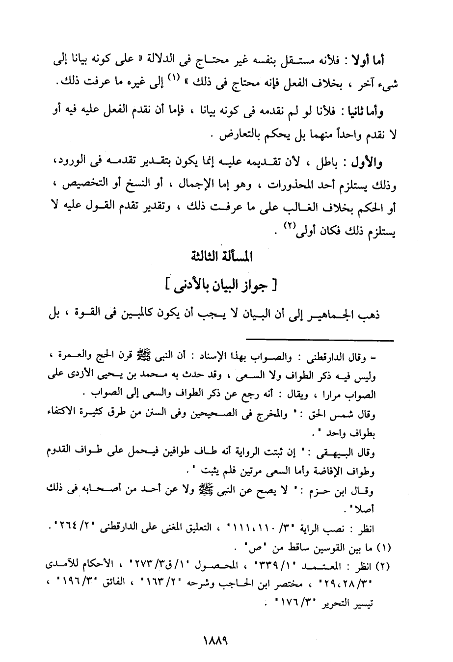 والأول: باطل، لأن تقديمه عليه إنما يكون بتقدير تقدمه في الورود، وذلك يستلزم أحد المحذورات، وهو إما الإجمال، أو النسخ أو التخصيص، أو الحكم بخلاف الغالب على ما عرفت ذلك، وتقدير تقدم القول عليه لا يستلزم ذلك فكان أولى.
