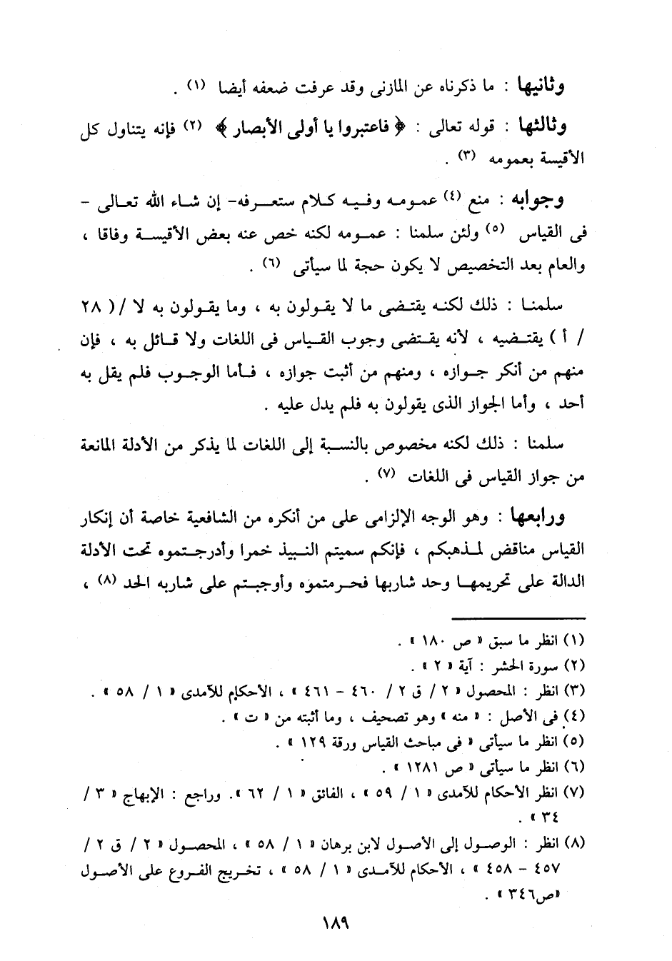 ورابعها: وهو الوجه الإلزامي على من أنكره من الشافعية خاصة أن إنكار القياس مناقض لمذهبكم، فإنكم سميتم النبيذ خمرا وأدرجتموه تحت الأدلة الدالة على تحريمها وحد شاربها فحرمتموه وأوجبتم على شاربه الحد،