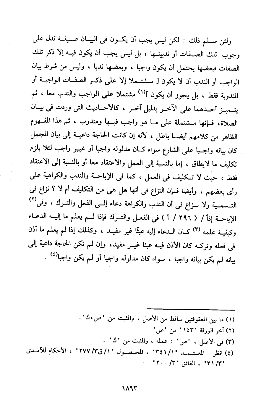 ولئن سلم ذلك/ لكن ليس يجب أن يكون في البيان صيغة تدل على وجوب تلك الصفات أو ندبيتها، بل ليس يجب أن يكون فيه إلا ذكر تلك الصفات فبعضها يحتمل أن يكون واجبا، وبعضها ندبا، وليس من شرط بيان الواجب أو الندب أن لا يكون] مشتملا إلا على ذكر الصفات الواجبة أو المندوبة فقط، بل يجوز أن يكون [مشتملا على الواجب والندب معا، ثم يتميز أحدهما على الآخر بدليل آخر، كالأحاديث التي وردت في بيان الصلاة، فإنها مشتملة على ما هو واجب فيها ومندوب، ثم هذا المفهوم الظاهر من كلامهم أيضا باطل، لأنه إن كانت الحاجة داعية إلى بيان المجمل كان بيانه واجبا على الشارع سواء كان مدلوله واجبا أو غير واجب لئلا يلزم تكليف ما لا يطاق، إما بالنسبة إلى العمل والاعتقاد معا أو بالنسبة إلى الاعتقاد فقط، حيث لا تكليف في العمل، كما في الإباحة والندب والكراهية على رأي بعضهم، وأيضا فإن النزاع في أنها هل هي من التكليف أم لا؟ نزاع في التسمية ولا نزاع في أن الندب والكراهة دعاء إلى الفعل والترك، وفي الإباحة إذا / (296/أ) في الفعل والترك فإذا لم يعلم ما إليه الدعاء وكيفية علمه كان الدعاء إليه عبثا غير مفيد، وكذلك إذا لم يعلم ما أذن في فعله وتركه كان الأذن فيه عبثا غير مفيد، وإن لم تكن الحاجة داعية إلى بيانه لم يكن بيانه واجبا، سواء كان مدلوله واجبا أو لم يكن واجباً.