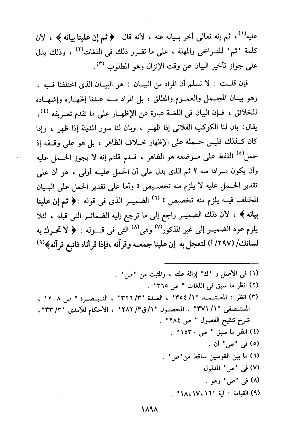 فإن قلت: لا نسلم أن المراد من البيان: هو البيان الذي اختلفنا فيه، وهو بيان المجمل والعموم والمطلق، بل المراد منه عندنا إظهارا وإشهاده للخلائق، فإن البيان في اللغة عبارة عن الإظهار على ما تقدم تعريفه، يقال: بان لنا الكوكب الفلاني إذا ظهر، وبان لنا سور المدينة إذا ظهر، وإذا كان كذلك فليس حمله على الإظهار خلاف الظاهر، بل هو على وقفه إذ حمل اللفظ على موضعه وهو الظاهر، فلم قلتم إنه لا يجوز الحمل عليه وأن يكون مرادا منه؟ ثم الذي يدل على أن الحمل عليه أولى، هو أن على تقدير الحمل عليه لا يلزم منه تخصيص "وأما على تقدير الحمل على البيان المختلف فيه يلزم منه تخصيص" الضمير الذي في قوله:} ثم إن علينا بيانه {، لأن ذلك الضمير راجع إلى ما ترجع إلية الضمائر التي قبله، لئلا يلزم عود الضمير إلى غير المذكور وهي التي في قوله:} لا تحرك به لسانك / (297/أ) لتعجل به إن علينا جمعه وقرآنه، فإذا قرأناه فاتبع قرآنه {.